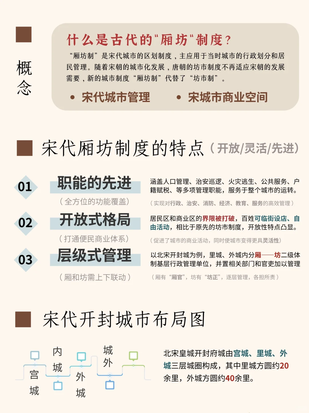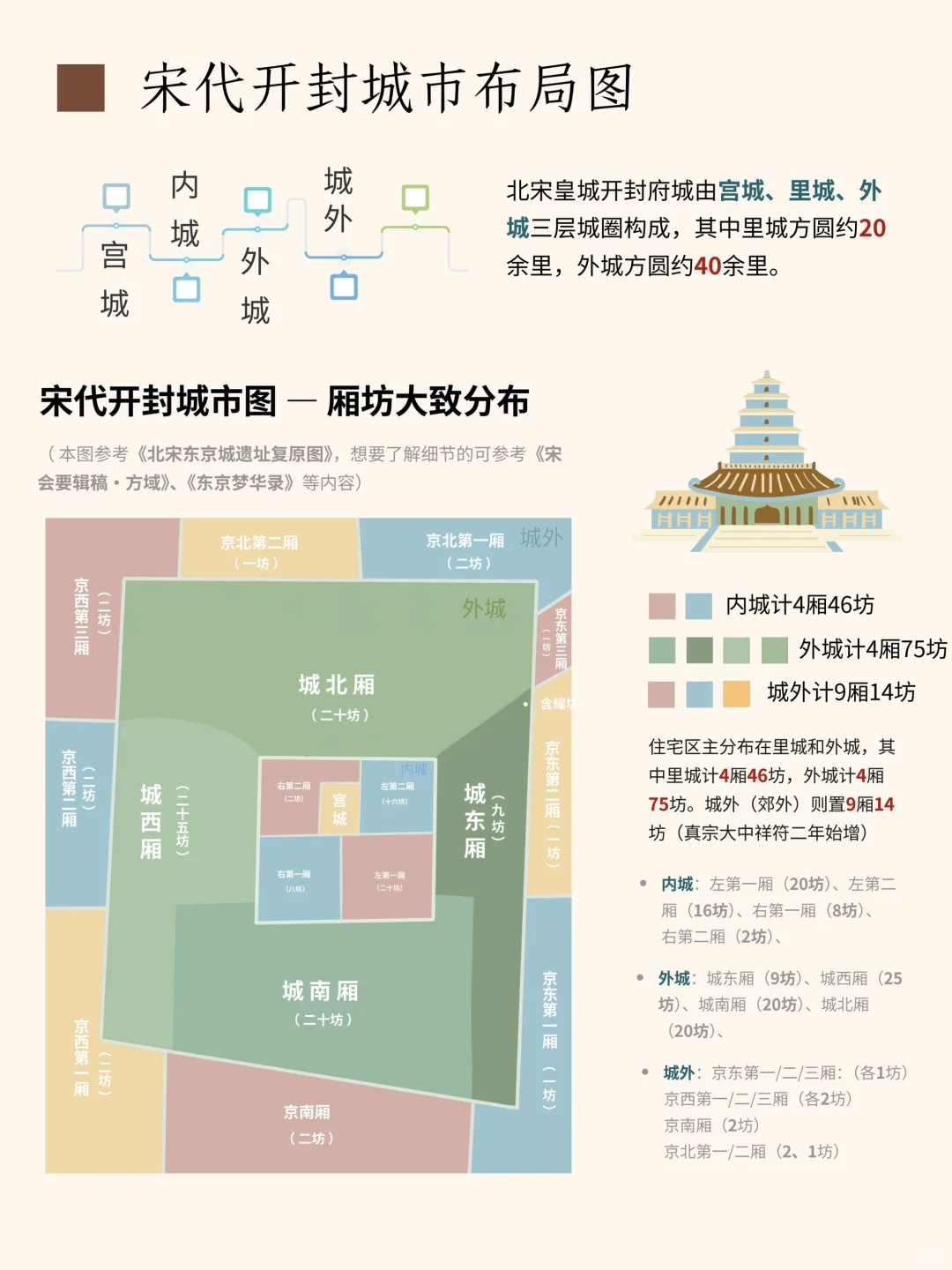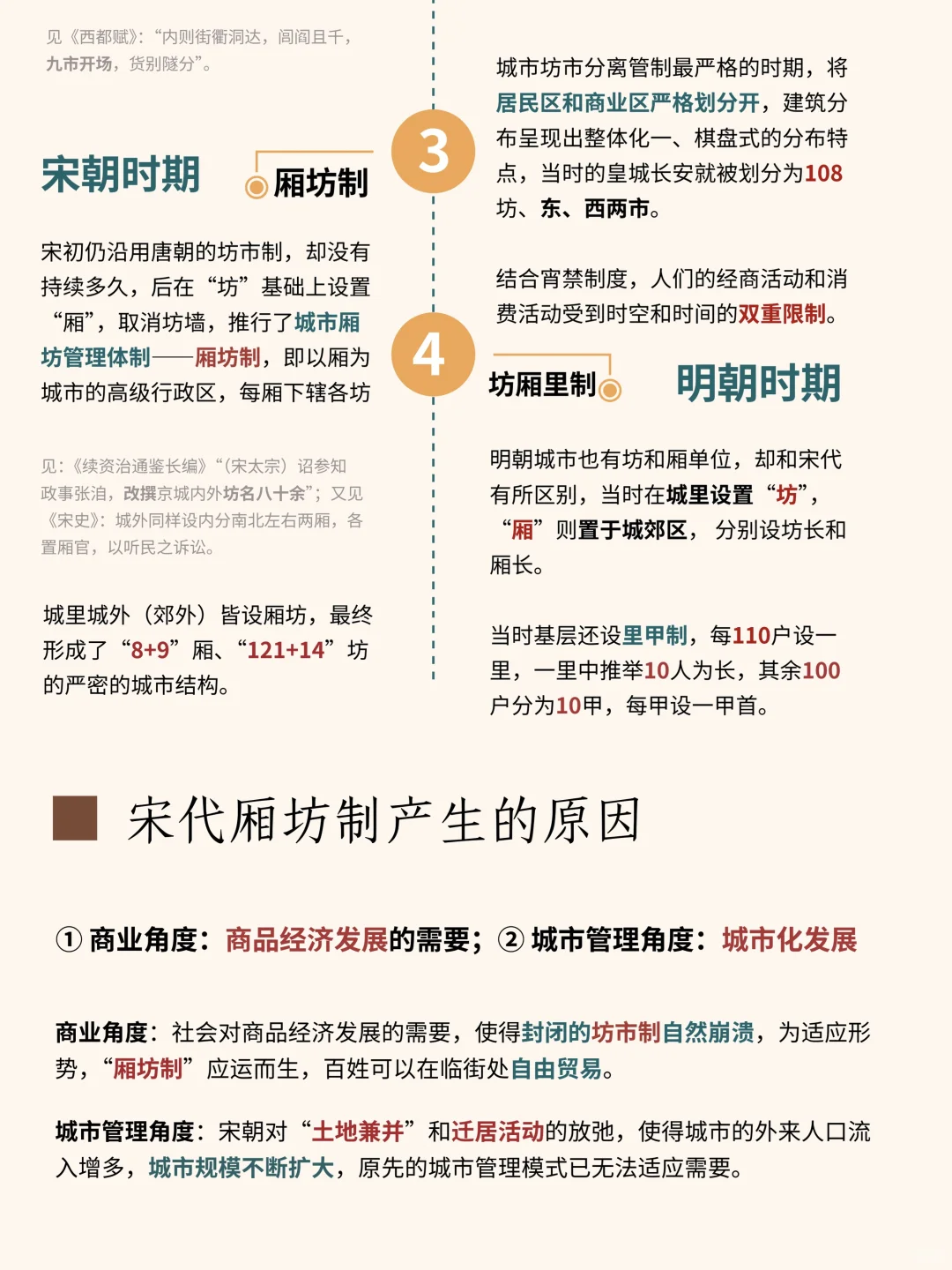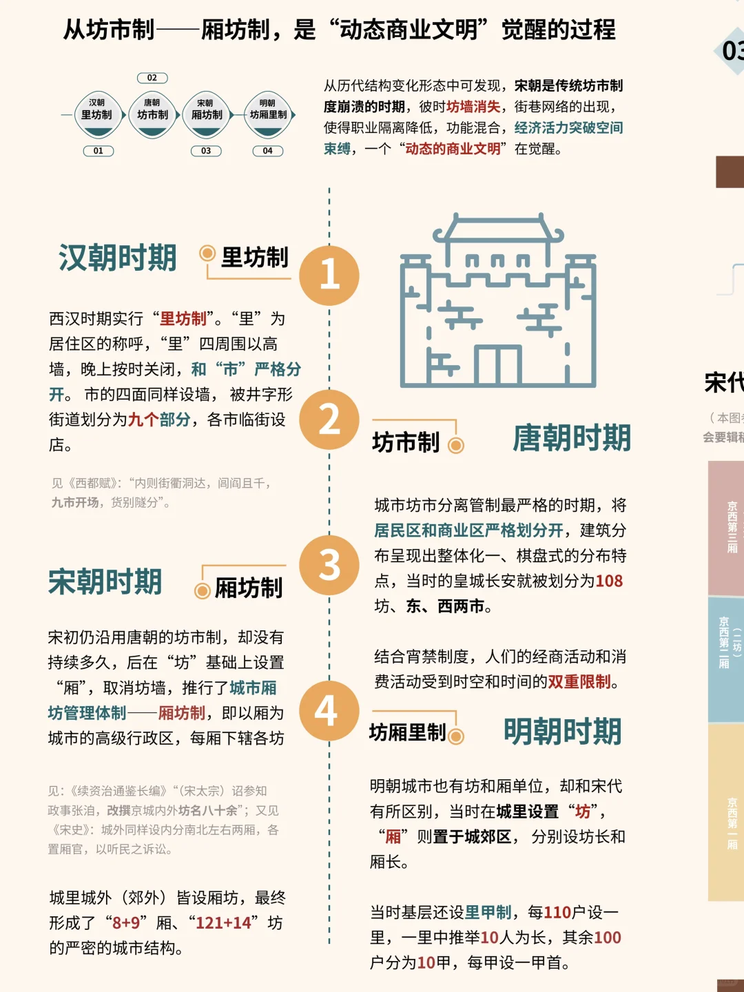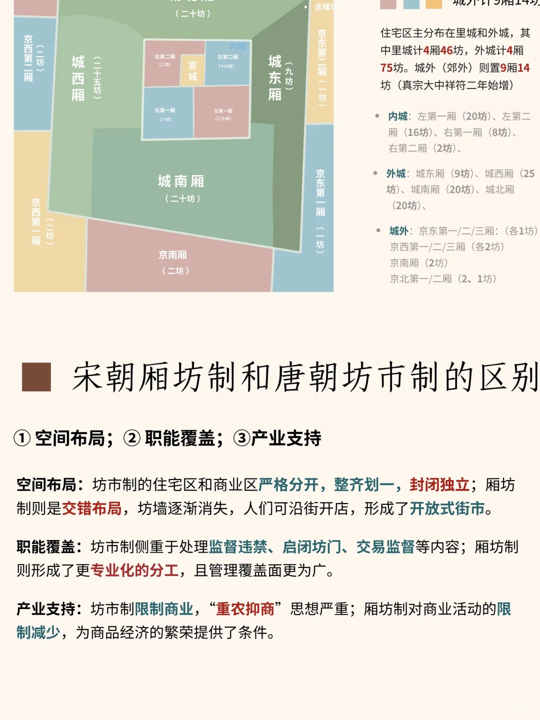 唐朝是城市坊市分离管制得较为严格的时期,即将居民区和商业区严格划分开,建筑分布呈现出整体化一、封闭独立棋盘式的分布特点,当时的皇城长安就被划分为108坊和东、西两市,人们只能在规定时间内到市区贸易。 宋初仍沿用唐朝的坊市制,却没有持续多久,后在“坊”基础上设置“厢”,取消坊墙,推行了城市厢坊管理体制——厢坊制,即以厢为城市的高级行政区,每厢下辖各坊,厢坊制则是交错布局,人们可沿街开店,形成了开放式街市。 可以说,宋朝是传统坊市制度崩溃的时期,彼时坊墙消失,街巷网络的出现,使得职业隔离降低,功能混合,经济活力突破空间束缚,一个“动态的商业文明”在觉醒。