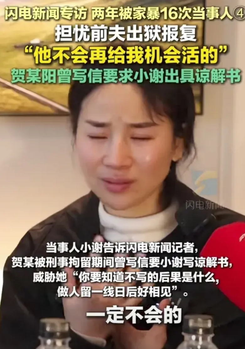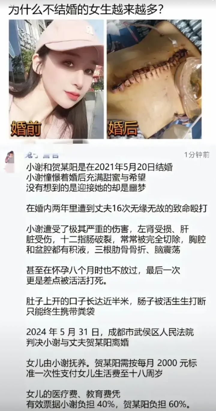 那个只剩下半条命的女子镜头前痛哭,“我的人生进入了倒计时,只有11年了。” 期待的死刑成了11年有期徒刑,11年后,前夫疯狂的报复将如达摩克利斯剑日夜悬挂在她头上。 蛇不知自己有毒,恶人也不知自己有罪。 贺某阳不知自己有错,不道歉,威胁她出谅解书,“做人留一线”其父扬言要杀她全家。 那个婚前老实忠厚的前夫贺某阳两年内 家暴她16次。 最后一次是她起诉,并申请了人身保护令,被骗至酒店进行长达八小时辱骂,殴打,她几度昏迷。 清晨,她挪到卫生间,向门外酒店人员呼救,旋即贺某阳拉进房内。酒店人员报了警。 贺某阳答应送小谢去医院,9分钟的路程开了两个多小时。 而正因为他给小谢买了止痛药,并送医院,被认为主观上无杀人动机,是故意伤害罪而非杀人未遂。 而她如果送去医院再晚20分钟,就神仙难救。 小谢在icu躺了8天,全身插满管子,肚子上多了个造瘘袋,终生要挂粪袋。 肋骨断了六七根,肠肝肺肾等等脏器全部严重受损。还有脑震荡。20 各种伤伤情鉴定结果每一项都触目惊心。 她不是愚妇,只是识人不清。 怀孕六天,第一次家暴,贺某跪求原谅 怀孕七八个月,贺某照打无误 2022年9月25日,拿钢刀砍她头 23年4月15日,滚烫的砂锅连泼她四次。 每个月都会暴打她一次。 怕了,跑了,拉黑所有联系方式,不管躲到哪里也会被他找到。 报警了,不下六次报警。 每次口头警告,出具家庭暴力劝诫书。(无效) 提离婚了 可是,提一次,被打一次 起诉了,差点被打死。 妇联,社区,市长热线都找了 小谢说为什么有了一纸结婚证,为什么家暴可以是家庭纷争,打人者可以逍遥法外? 我也㎴理解,嫁错了人, 遇到家暴男 跑不掉,离不掉,难到非要以同归于尽 的方式,才可以结束噩梦?