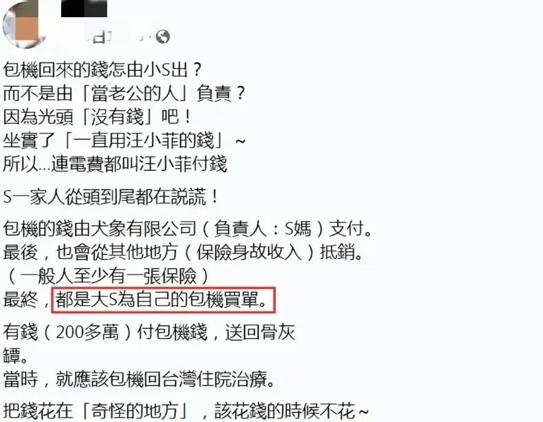 包机费用是大S自掏腰包啊!太讽刺了,原来大S自己包机把自己送回了家。 谁说的,包机是小S全额出资?小S现在应该没脸再出来作妖了,原来从头到尾都在说谎。难怪要给姐姐树葬…… 近日,湾湾艺人陶晶莹还声称具俊晔有才华有实力,不是吃软饭的人。老婆大S去世,正常来说应该是具俊晔出资才对吧!由此看来,具俊晔不是没有钱,就是铁公鸡一毛不拔。