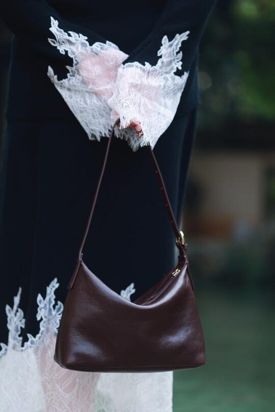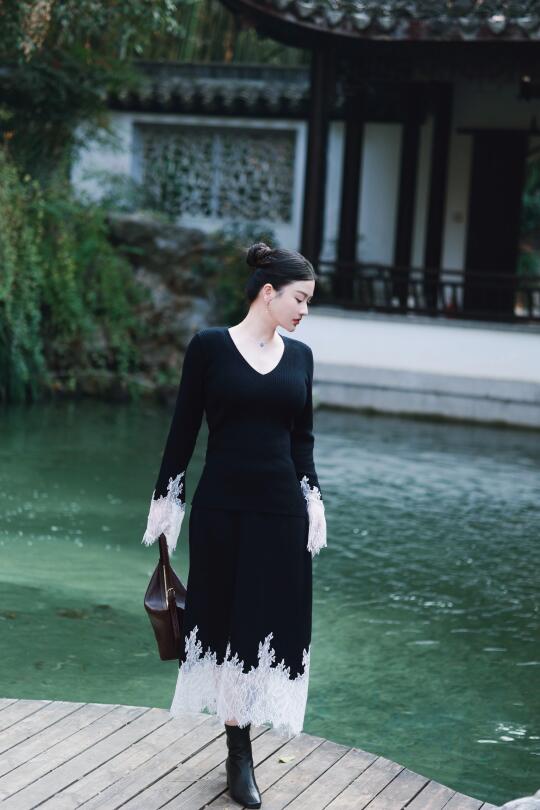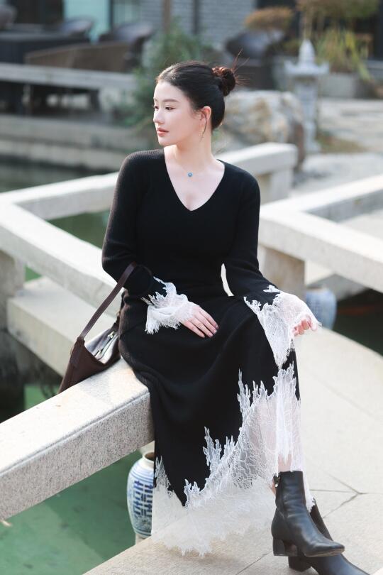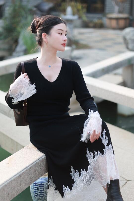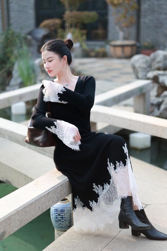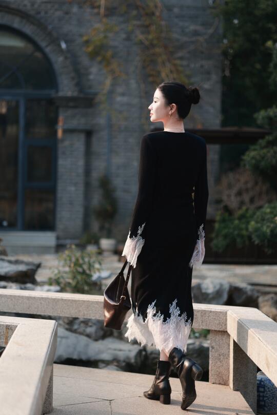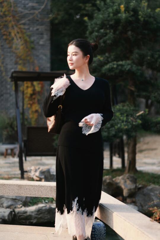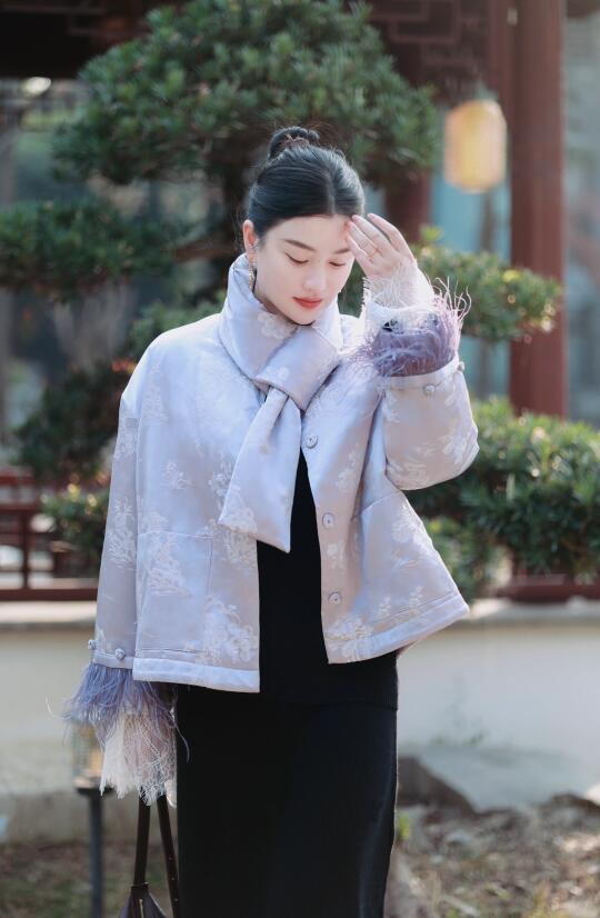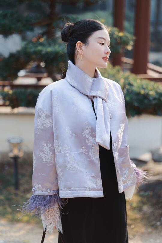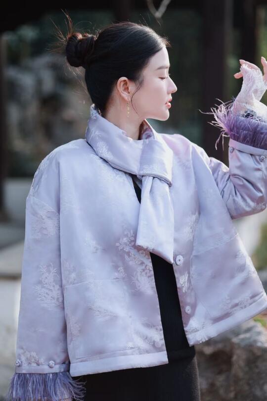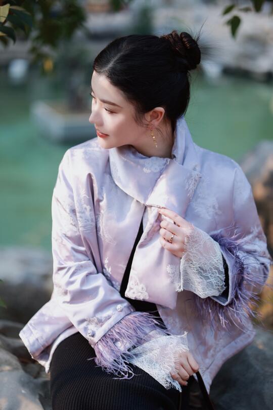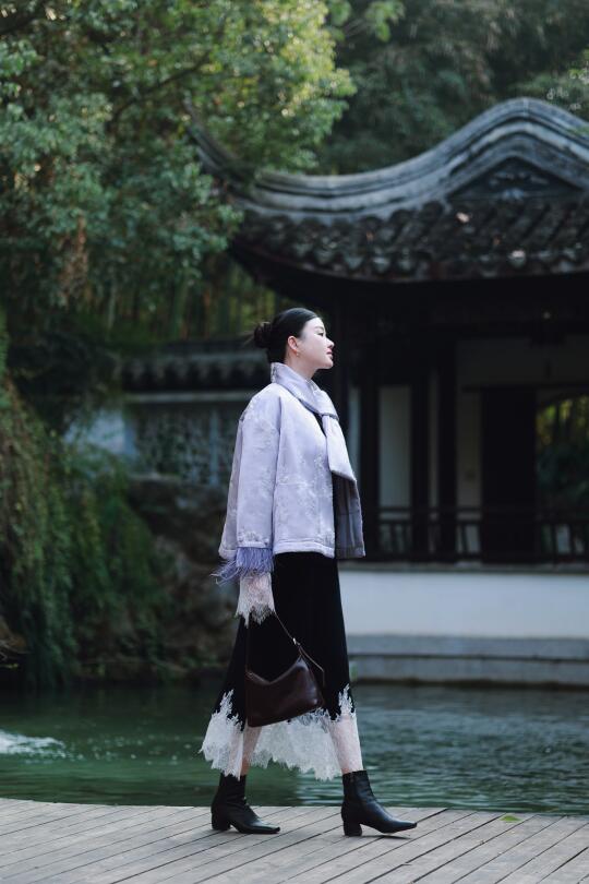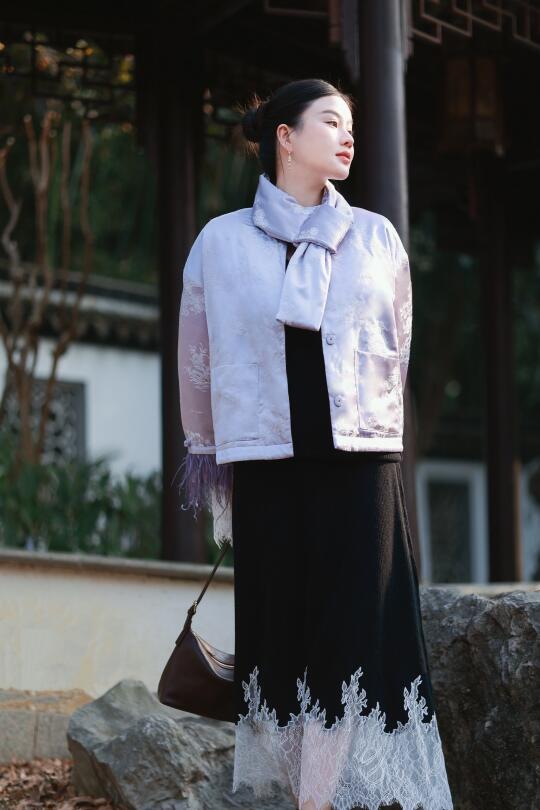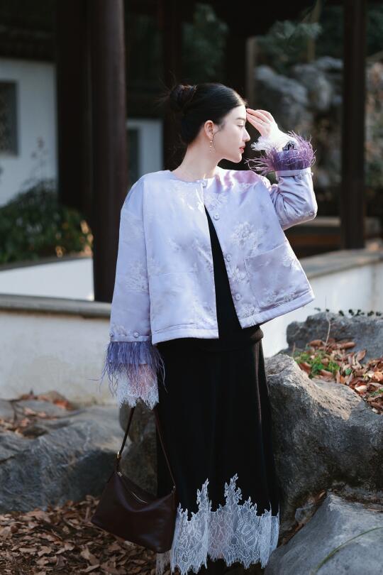 不到园林怎知春如许? 🌷新中式亦可以浅春系。宋代风格的圆领对襟棉服,一抹远山紫如同山间的薄雾,如暮色柔和淡雅。 内搭黑裙像舞者的蕾丝裙,袖口与裙摆的蕾丝,如雪后初霁,如潺潺溪流,灵动飘逸。
