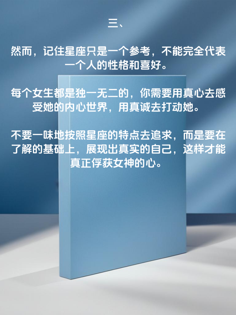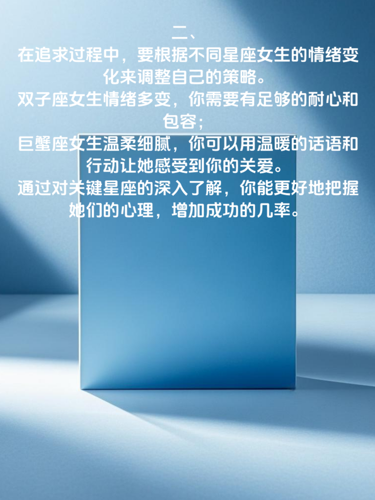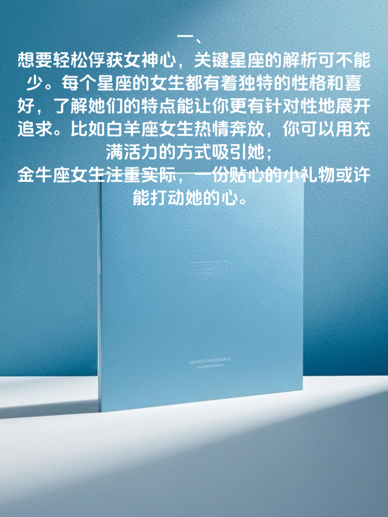 一、想要轻松俘获女神心,关键星座的解析可不能少。每个星座的女生都有着独特的性格和喜好,了解她们的特点能让你更有针对性地展开追求。比如白羊座女生热情奔放,你可以用充满活力的方式吸引她;金牛座女生注重实际,一份贴心的小礼物或许能打动她的心。 二、在追求过程中,要根据不同星座女生的情绪变化来调整自己的策略。双子座女生情绪多变,你需要有足够的耐心和包容;巨蟹座女生温柔细腻,你可以用温暖的话语和行动让她感受到你的关爱。通过对关键星座的深入了解,你能更好地把握她们的心理,增加成功的几率。 三、然而,记住星座只是一个参考,不能完全代表一个人的性格和喜好。每个女生都是独一无二的,你需要用真心去感受她的内心世界,用真诚去打动她。不要一味地按照星座的特点去追求,而是要在了解的基础上,展现出真实的自己,这样才能真正俘获女神的心。