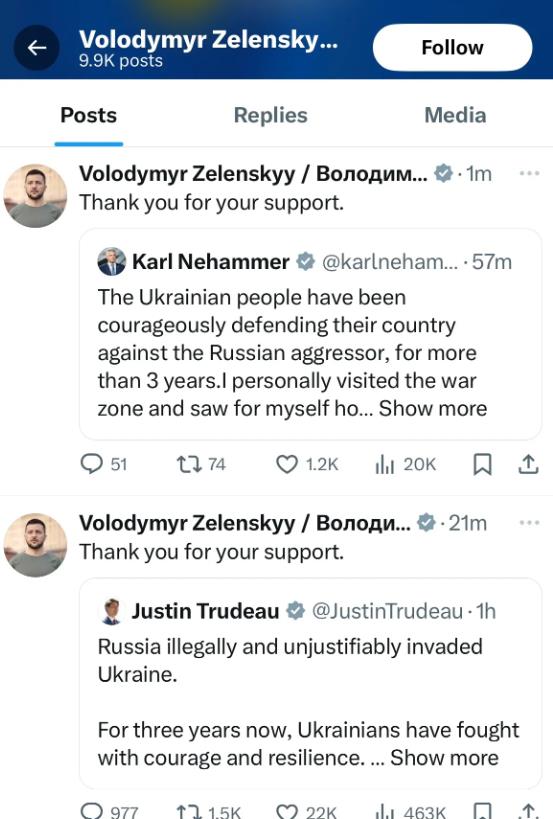 欧洲各国领导人、加拿大总理特鲁多纷纷发文力挺乌克兰,强调俄罗斯才是侵略者。泽连斯基向他们一一表示感谢。