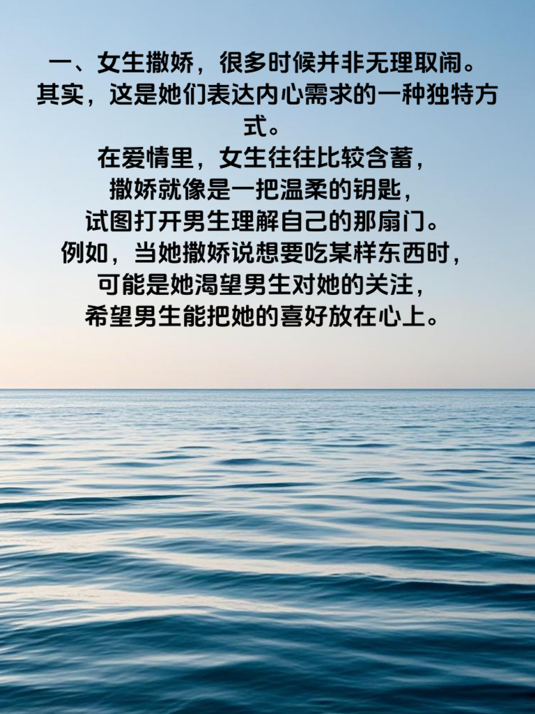 一、女生撒娇,很多时候并非无理取闹。其实,这是她们表达内心需求的一种独特方式。在爱情里,女生往往比较含蓄,撒娇就像是一把温柔的钥匙,试图打开男生理解自己的那扇门。例如,当她撒娇说想要吃某样东西时,可能是她渴望男生对她的关注,希望男生能把她的喜好放在心上。 二、有时候,女生撒娇是为了化解矛盾。在发生争执后,比起激烈的争吵或者冷战,撒娇能让紧张的气氛迅速缓和。她用一种略带孩子气的方式向男生示弱,这其实是一种爱的表现,她不想让矛盾影响到彼此的感情,用撒娇来传达‘我不想跟你生气,我更在乎你’的信号。 三、女生撒娇也是在寻求安全感。在感情中,女生会时不时地通过撒娇来确认自己在男生心中的地位。如果男生能够包容她的撒娇,给予积极的回应,她就会觉得自己是被爱着的,是安全的。所以,男生们要懂得女生撒娇背后的这些真正目的,这样才能更好地经营感情。