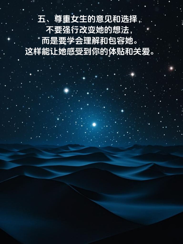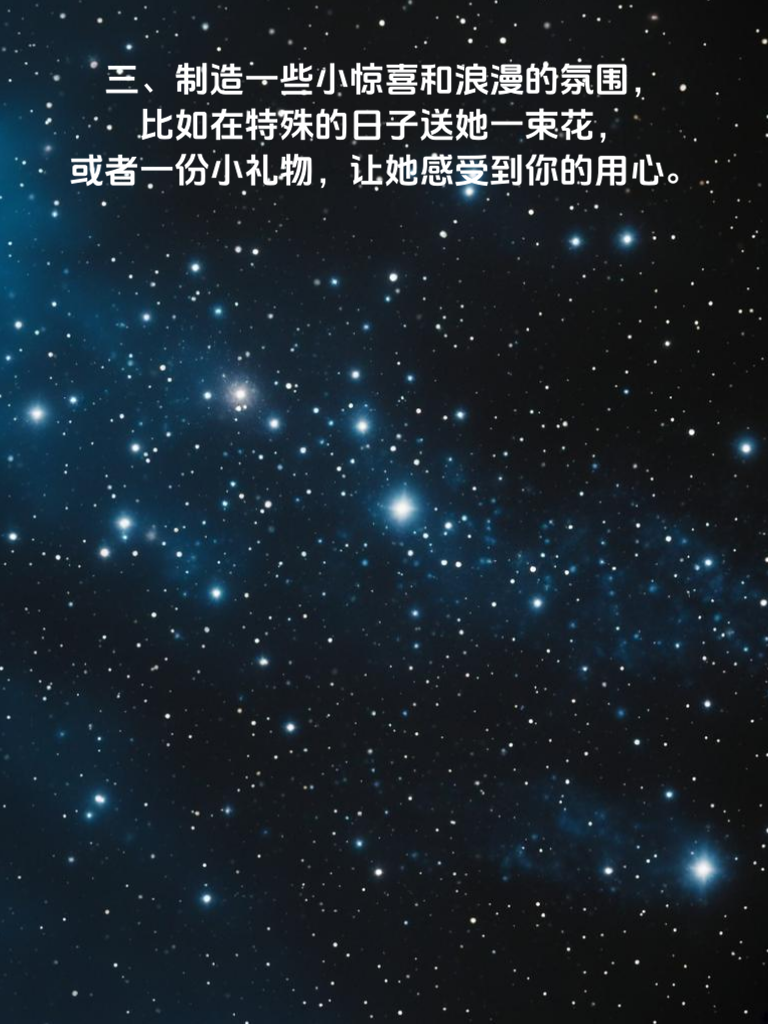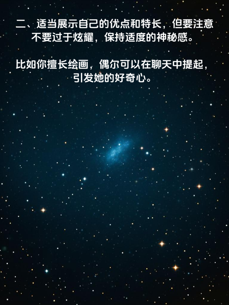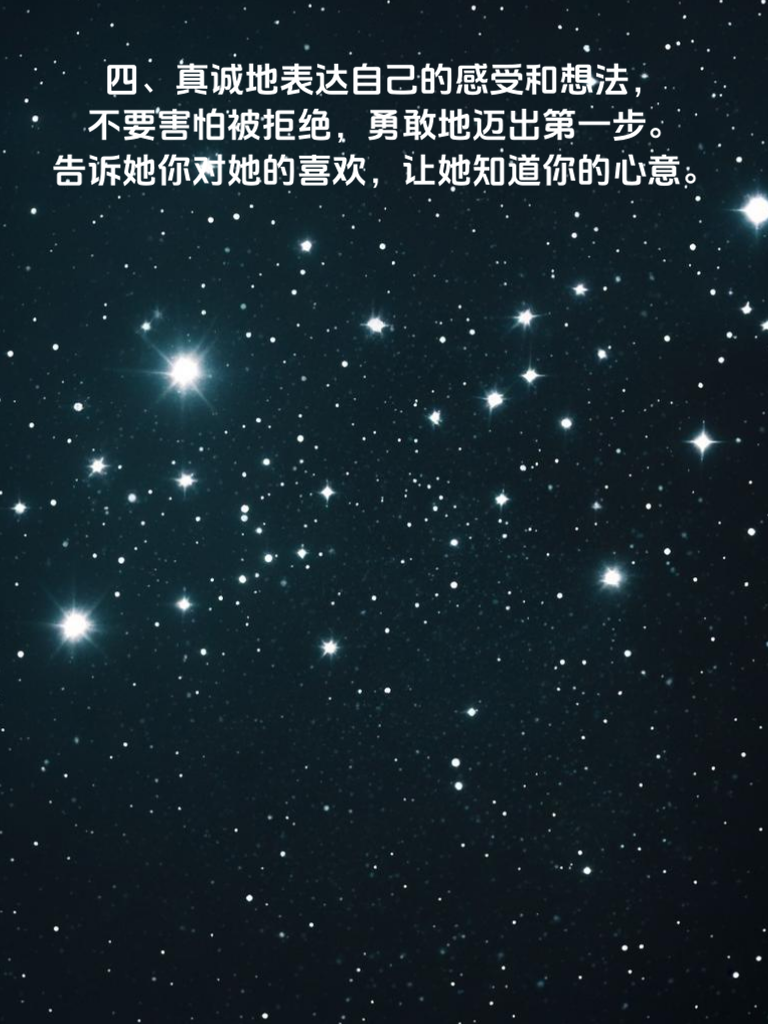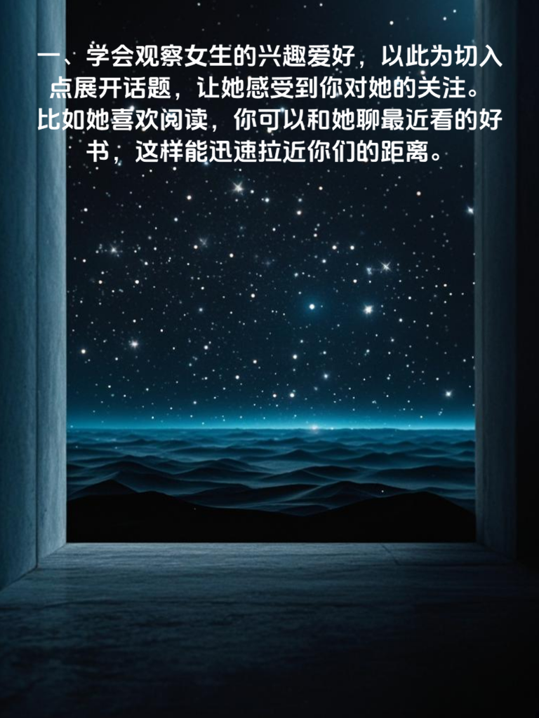 一、学会观察女生的兴趣爱好,以此为切入点展开话题,让她感受到你对她的关注。比如她喜欢阅读,你可以和她聊最近看的好书,这样能迅速拉近你们的距离。 二、适当展示自己的优点和特长,但要注意不要过于炫耀,保持适度的神秘感。比如你擅长绘画,偶尔可以在聊天中提起,引发她的好奇心。 三、制造一些小惊喜和浪漫的氛围,比如在特殊的日子送她一束花或者一份小礼物,让她感受到你的用心。 四、真诚地表达自己的感受和想法,不要害怕被拒绝,勇敢地迈出第一步。告诉她你对她的喜欢,让她知道你的心意。 五、尊重女生的意见和选择,不要强行改变她的想法,而是要学会理解和包容她。这样能让她感受到你的体贴和关爱。