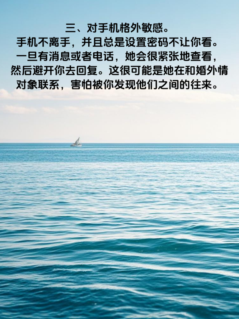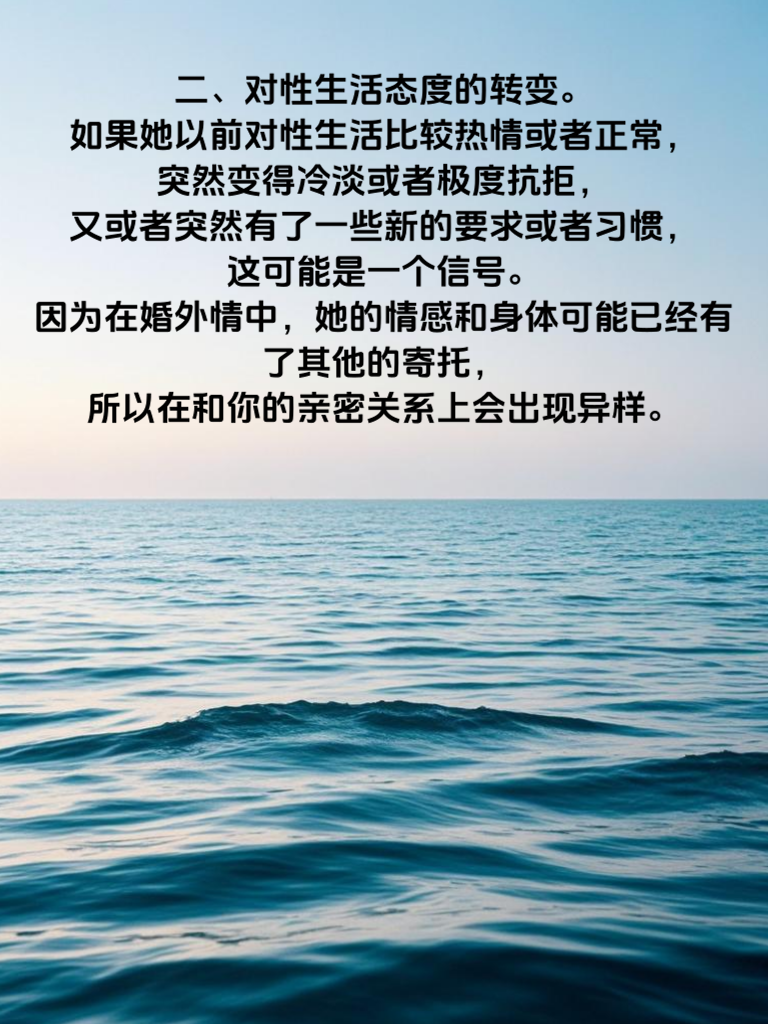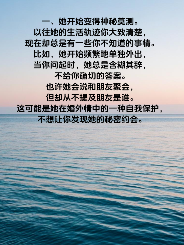 一、她开始变得神秘莫测。以往她的生活轨迹你大致清楚,现在却总是有一些你不知道的事情。比如,她开始频繁地单独外出,当你问起时,她总是含糊其辞,不给你确切的答案。也许她会说和朋友聚会,但却从不提及朋友是谁。这可能是她在婚外情中的一种自我保护,不想让你发现她的秘密约会。 二、对性生活态度的转变。如果她以前对性生活比较热情或者正常,突然变得冷淡或者极度抗拒,又或者突然有了一些新的要求或者习惯,这可能是一个信号。因为在婚外情中,她的情感和身体可能已经有了其他的寄托,所以在和你的亲密关系上会出现异样。 三、对手机格外敏感。手机不离手,并且总是设置密码不让你看。一旦有消息或者电话,她会很紧张地查看,然后避开你去回复。这很可能是她在和婚外情对象联系,害怕被你发现他们之间的往来。