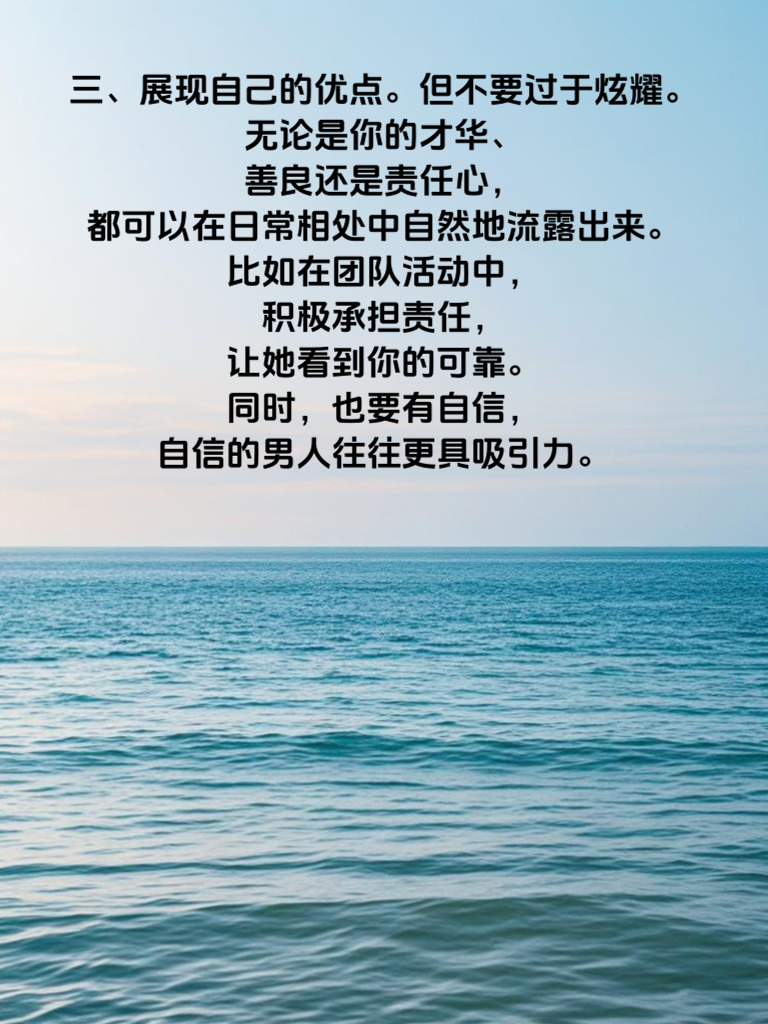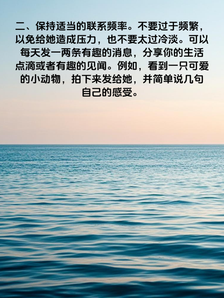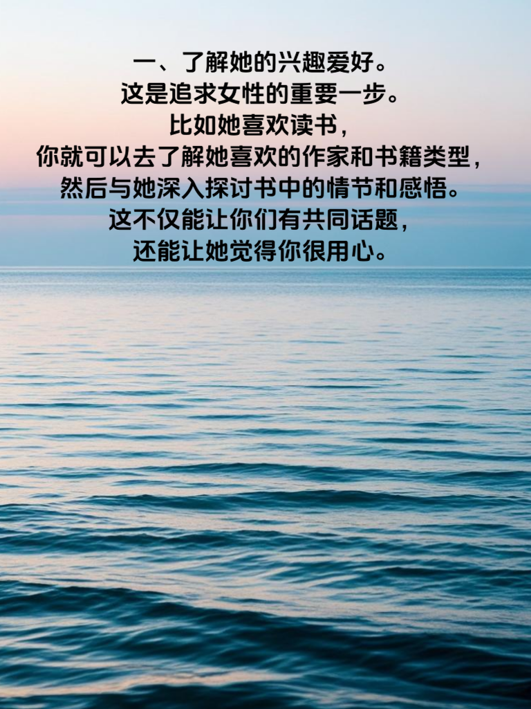 一、了解她的兴趣爱好。这是追求女性的重要一步。比如她喜欢读书,你就可以去了解她喜欢的作家和书籍类型,然后与她深入探讨书中的情节和感悟。这不仅能让你们有共同话题,还能让她觉得你很用心。 二、保持适当的联系频率。不要过于频繁,以免给她造成压力,也不要太过冷淡。可以每天发一两条有趣的消息,分享你的生活点滴或者有趣的见闻。例如,看到一只可爱的小动物,拍下来发给她,并简单说几句自己的感受。 三、展现自己的优点。但不要过于炫耀。无论是你的才华、善良还是责任心,都可以在日常相处中自然地流露出来。比如在团队活动中,积极承担责任,让她看到你的可靠。同时,也要有自信,自信的男人往往更具吸引力。