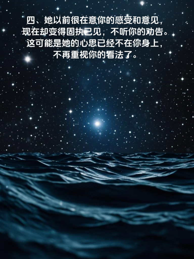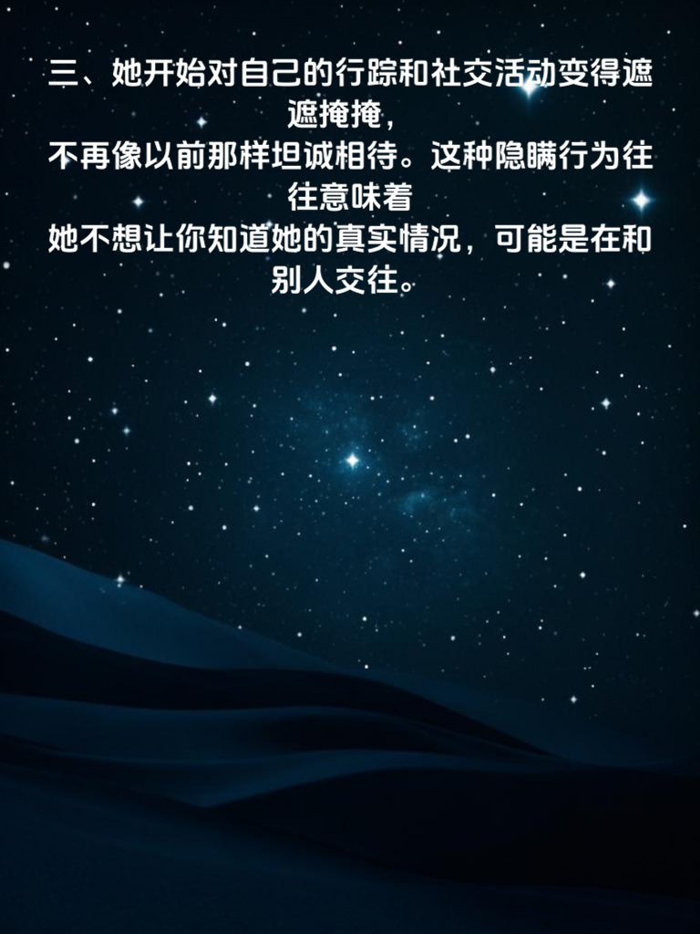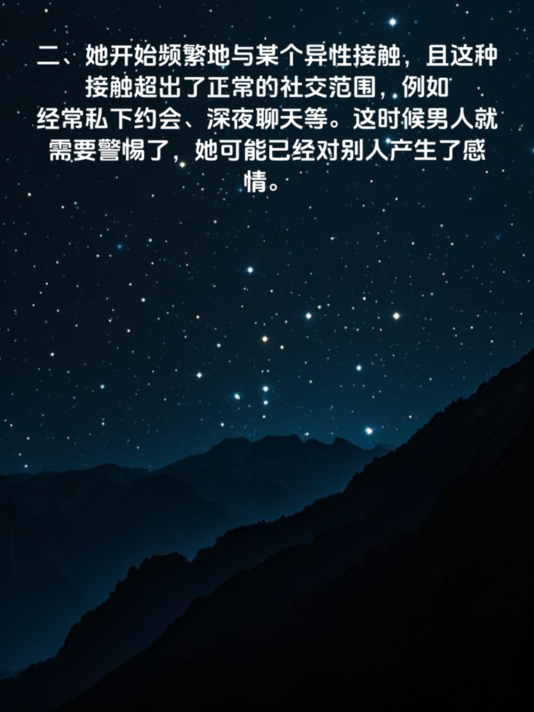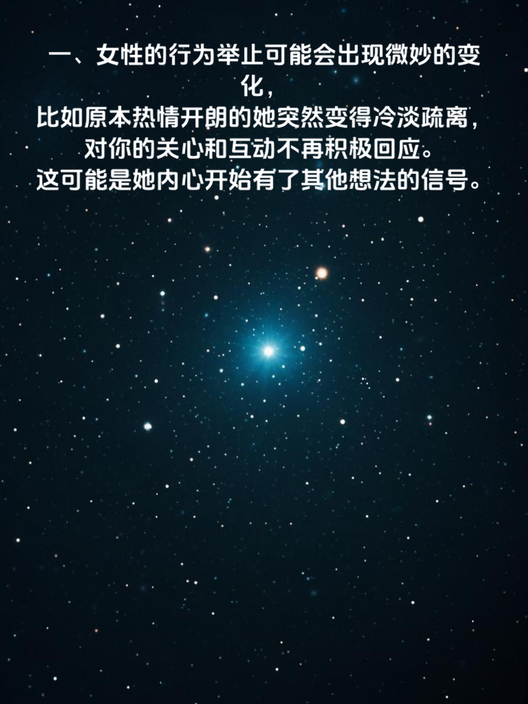 一、女性的行为举止可能会出现微妙的变化,比如原本热情开朗的她突然变得冷淡疏离,对你的关心和互动不再积极回应。这可能是她内心开始有了其他想法的信号。 二、她开始频繁地与某个异性接触,且这种接触超出了正常的社交范围,例如经常私下约会、深夜聊天等。这时候男人就需要警惕了,她可能已经对别人产生了感情。 三、她开始对自己的行踪和社交活动变得遮遮掩掩,不再像以前那样坦诚相待。这种隐瞒行为往往意味着她不想让你知道她的真实情况,可能是在和别人交往。 四、她以前很在意你的感受和意见,现在却变得固执己见,不听你的劝告。这可能是她的心思已经不在你身上,不再重视你的看法了。