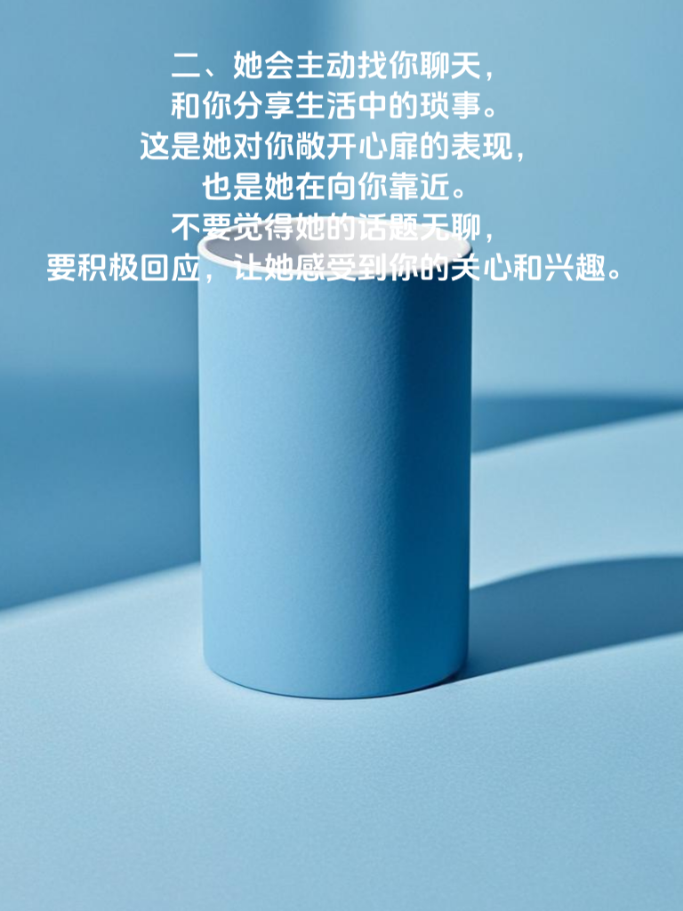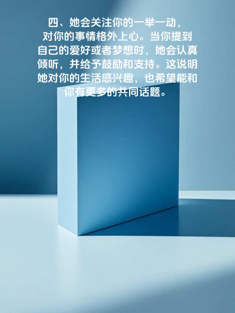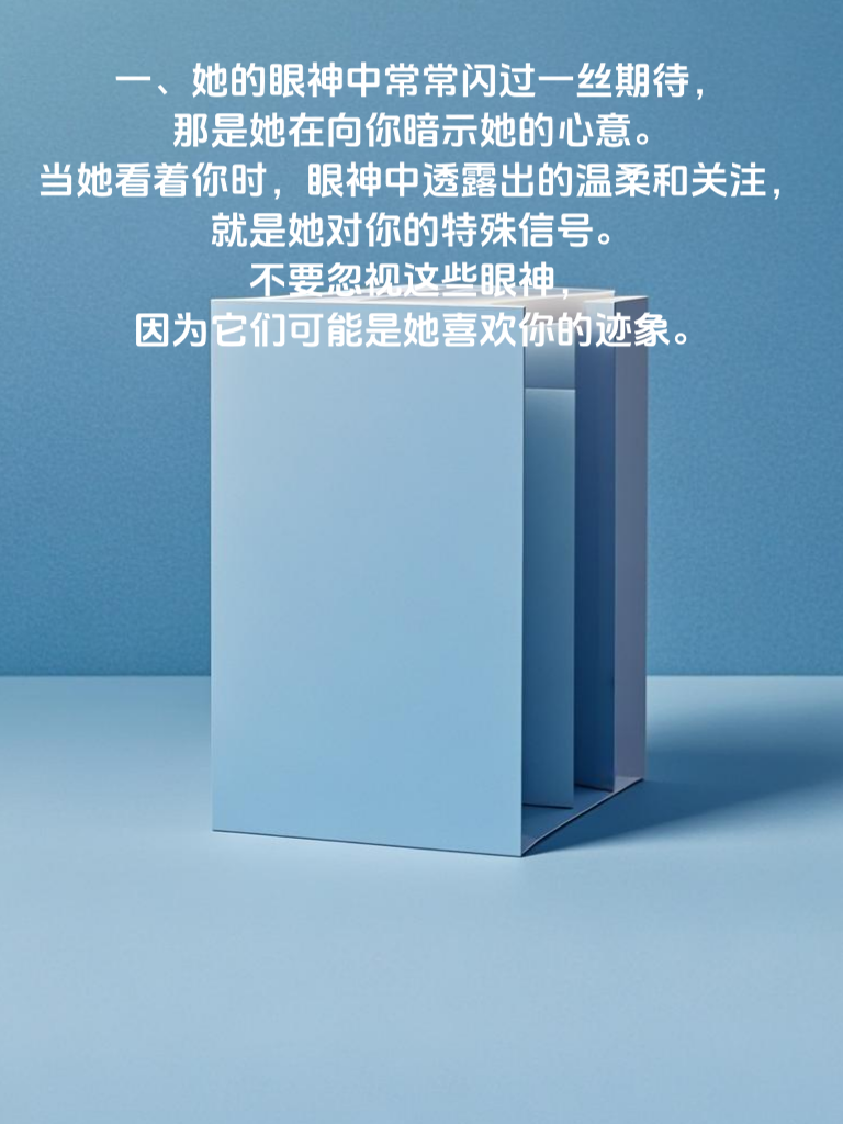 一、她的眼神中常常闪过一丝期待,那是她在向你暗示她的心意。当她看着你时,眼神中透露出的温柔和关注,就是她对你的特殊信号。不要忽视这些眼神,因为它们可能是她喜欢你的迹象。 二、她会主动找你聊天,和你分享生活中的琐事。这是她对你敞开心扉的表现,也是她在向你靠近。不要觉得她的话题无聊,要积极回应,让她感受到你的关心和兴趣。 三、她会在你面前展现出自己的柔弱一面。也许是不小心摔倒了,或者是遇到了困难,她希望你能在她身边,给予她帮助和支持。这是她对你信任的体现,不要让她失望。 四、她会关注你的一举一动,对你的事情格外上心。当你提到自己的爱好或者梦想时,她会认真倾听,并给予鼓励和支持。这说明她对你的生活感兴趣,也希望能和你有更多的共同话题。