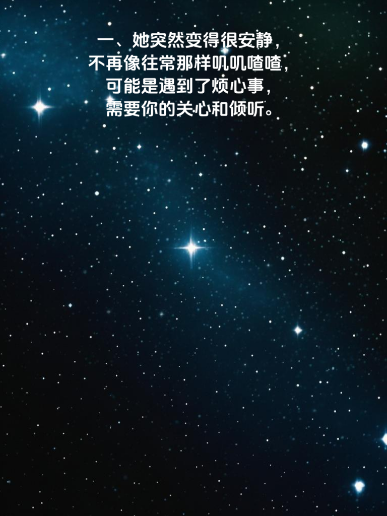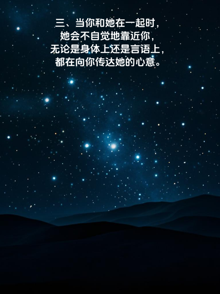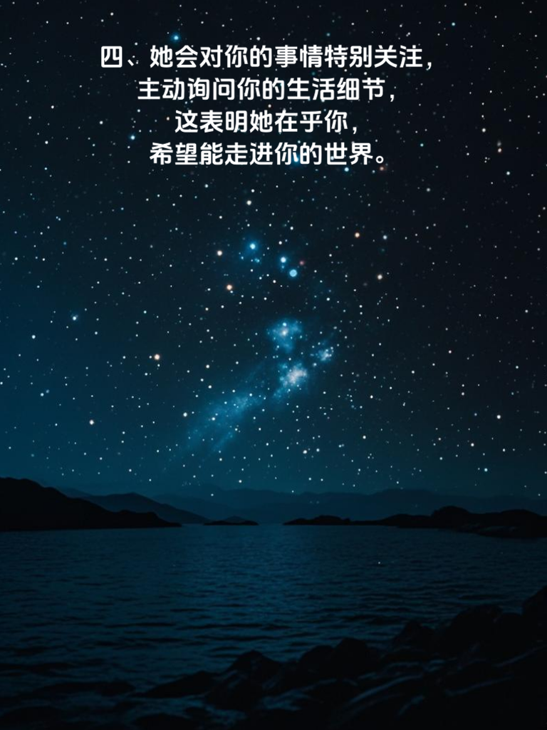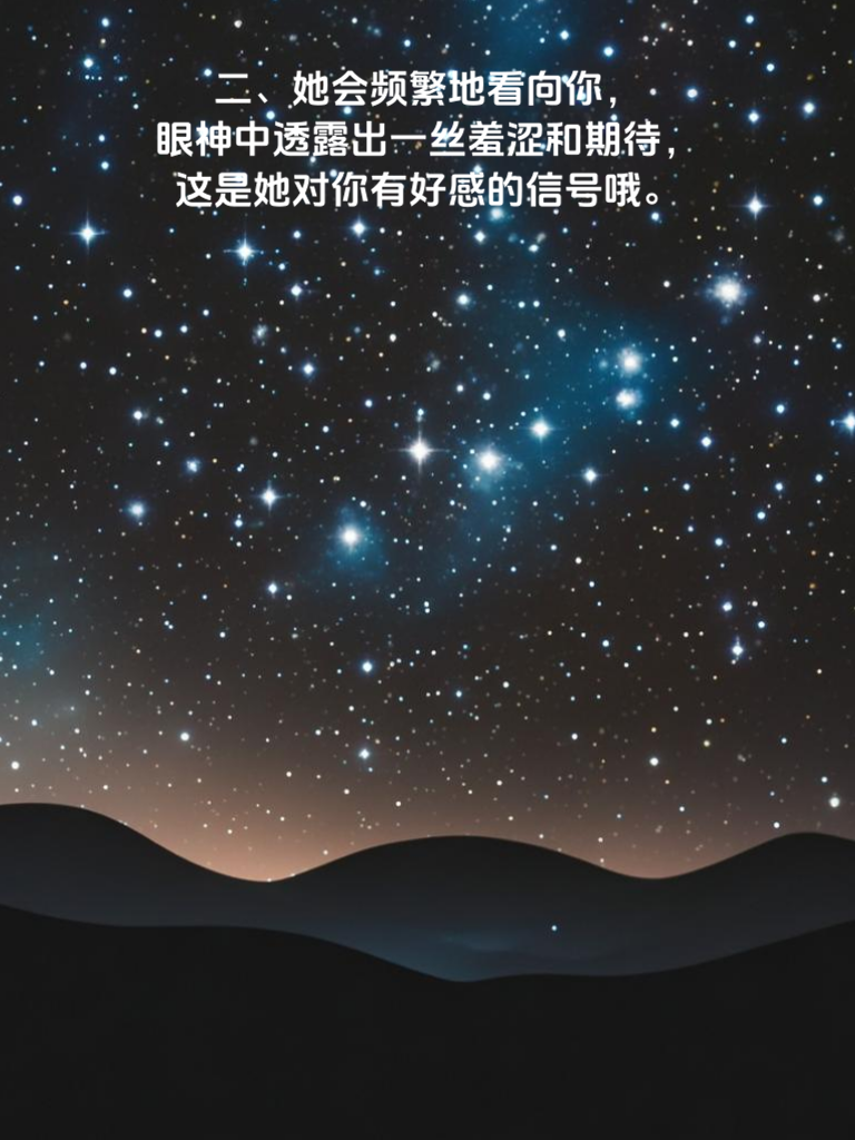 一、她突然变得很安静,不再像往常那样叽叽喳喳,可能是遇到了烦心事,需要你的关心和倾听。 二、她会频繁地看向你,眼神中透露出一丝羞涩和期待,这是她对你有好感的信号哦。 三、当你和她在一起时,她会不自觉地靠近你,无论是身体上还是言语上,都在向你传达她的心意。 四、她会对你的事情特别关注,主动询问你的生活细节,这表明她在乎你,希望能走进你的世界。
