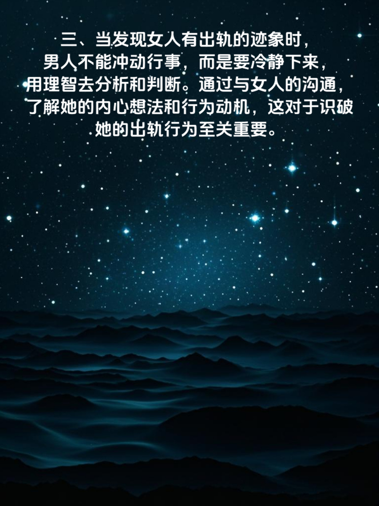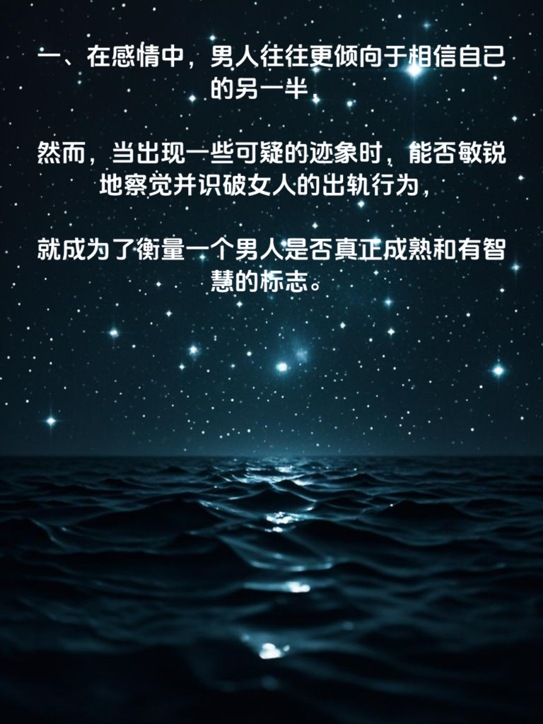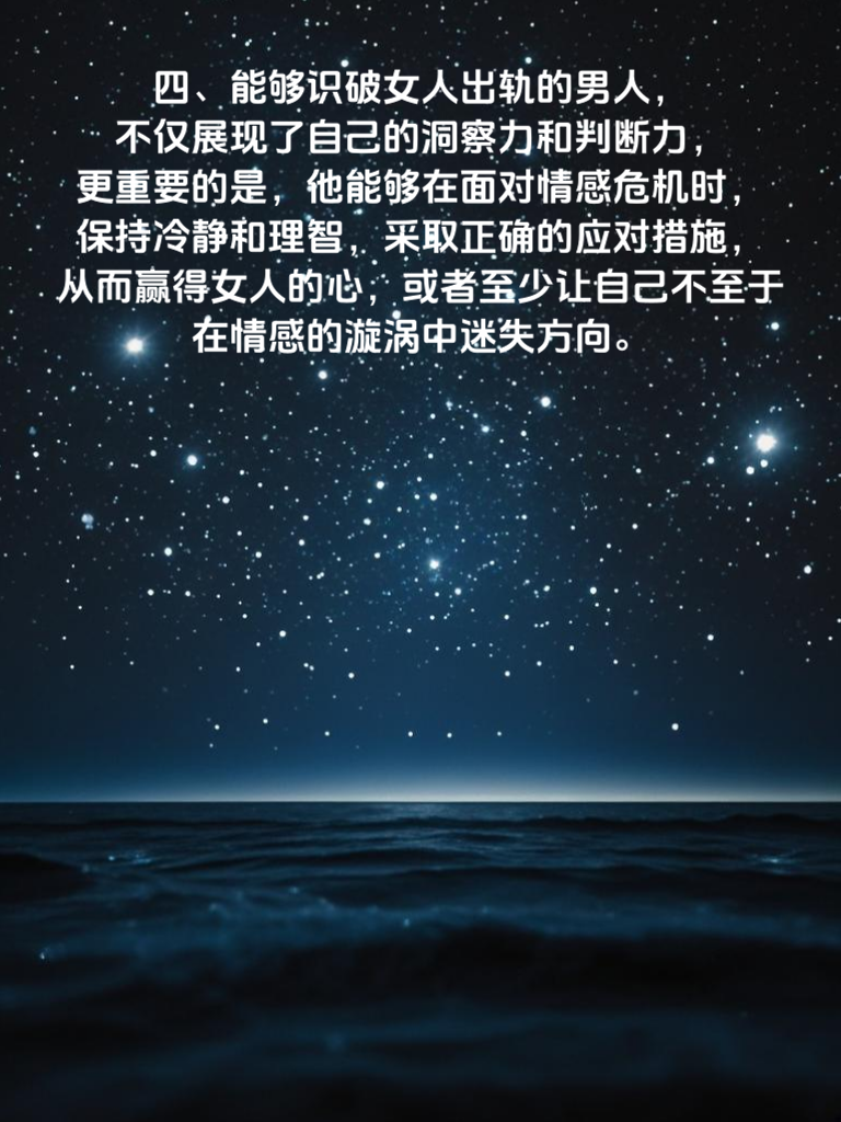 一、在感情中,男人往往更倾向于相信自己的另一半,然而,当出现一些可疑的迹象时,能否敏锐地察觉并识破女人的出轨行为,就成为了衡量一个男人是否真正成熟和有智慧的标志。 二、女人出轨时,可能会在日常行为中露出一些蛛丝马迹,比如突然变得神秘兮兮,频繁与某个异性联系,对自己的行踪遮遮掩掩等。而那些能够细心观察、善于捕捉这些细节的男人,就已经在这场情感的博弈中占据了先机。 三、当发现女人有出轨的迹象时,男人不能冲动行事,而是要冷静下来,用理智去分析和判断。通过与女人的沟通,了解她的内心想法和行为动机,这对于识破她的出轨行为至关重要。 四、能够识破女人出轨的男人,不仅展现了自己的洞察力和判断力,更重要的是,他能够在面对情感危机时,保持冷静和理智,采取正确的应对措施,从而赢得女人的心,或者至少让自己不至于在情感的漩涡中迷失方向。