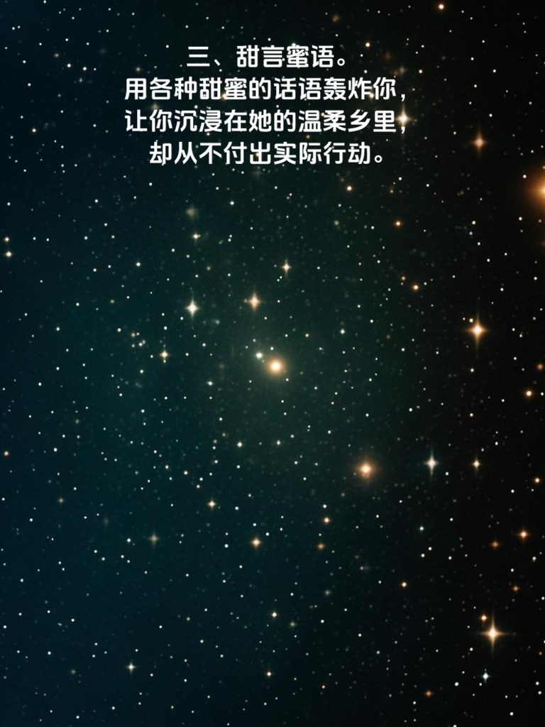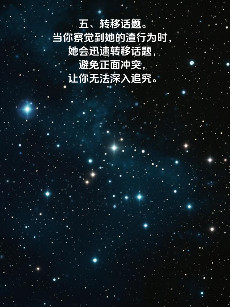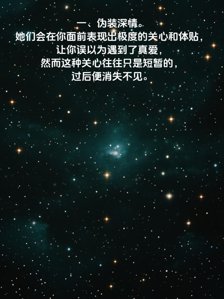 一、伪装深情。她们会在你面前表现出极度的关心和体贴,让你误以为遇到了真爱,然而这种关心往往只是短暂的,过后便消失不见。 二、模糊界限。渣女擅长在与多个男生的交往中模糊界限,让你分不清她到底对你是何种感情,给你一种她对你与众不同的错觉。 三、甜言蜜语。用各种甜蜜的话语轰炸你,让你沉浸在她的温柔乡里,却从不付出实际行动。 四、欲擒故纵。故意对你若即若离,让你时刻处于紧张和期待之中,从而更容易被她掌控。 五、转移话题。当你察觉到她的渣行为时,她会迅速转移话题,避免正面冲突,让你无法深入追究。