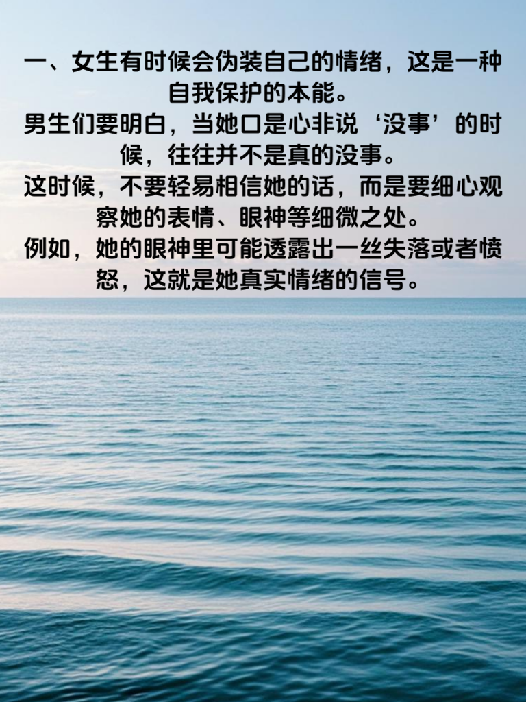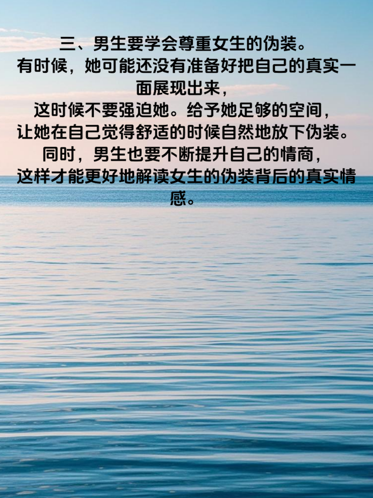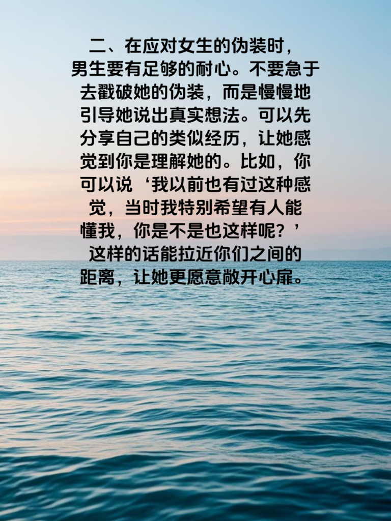 一、女生有时候会伪装自己的情绪,这是一种自我保护的本能。男生们要明白,当她口是心非说‘没事’的时候,往往并不是真的没事。这时候,不要轻易相信她的话,而是要细心观察她的表情、眼神等细微之处。例如,她的眼神里可能透露出一丝失落或者愤怒,这就是她真实情绪的信号。 二、在应对女生的伪装时,男生要有足够的耐心。不要急于去戳破她的伪装,而是慢慢地引导她说出真实想法。可以先分享自己的类似经历,让她感觉到你是理解她的。比如,你可以说‘我以前也有过这种感觉,当时我特别希望有人能懂我,你是不是也这样呢?’这样的话能拉近你们之间的距离,让她更愿意敞开心扉。 三、男生要学会尊重女生的伪装。有时候,她可能还没有准备好把自己的真实一面展现出来,这时候不要强迫她。给予她足够的空间,让她在自己觉得舒适的时候自然地放下伪装。同时,男生也要不断提升自己的情商,这样才能更好地解读女生的伪装背后的真实情感。