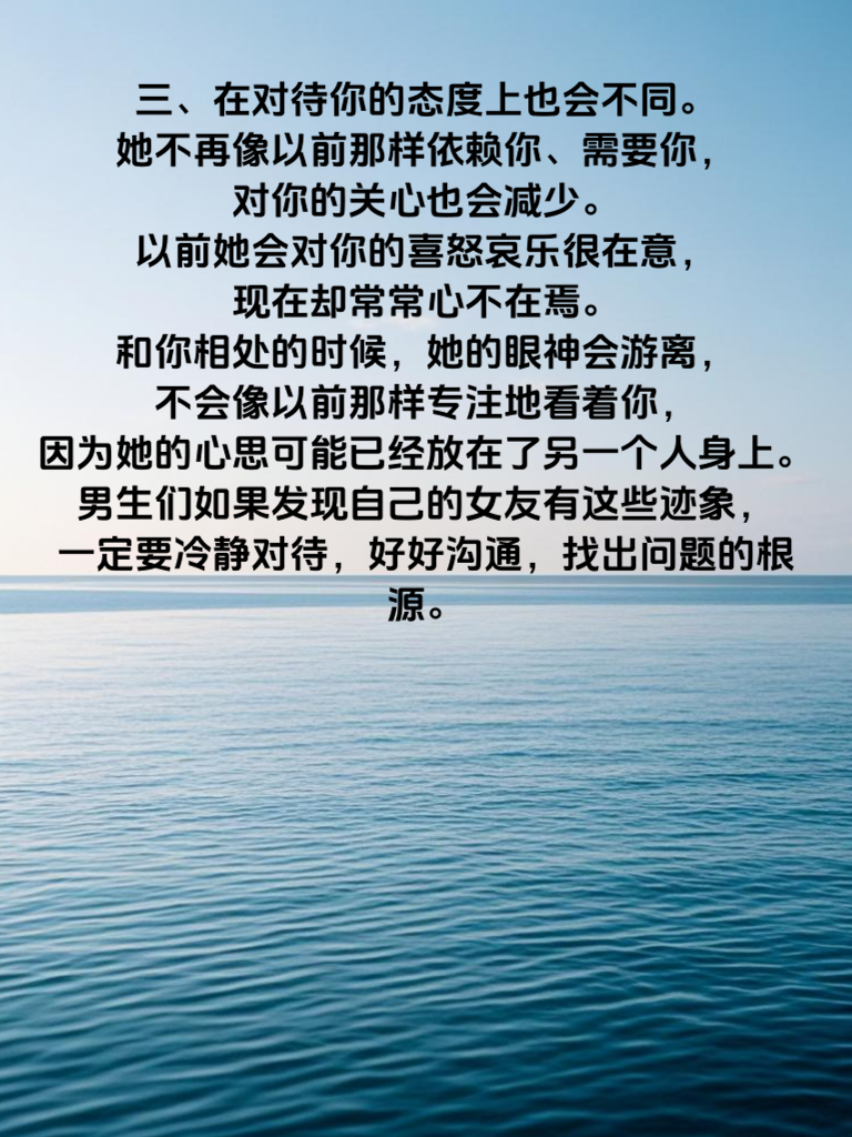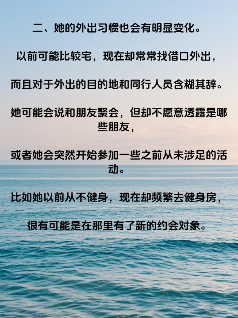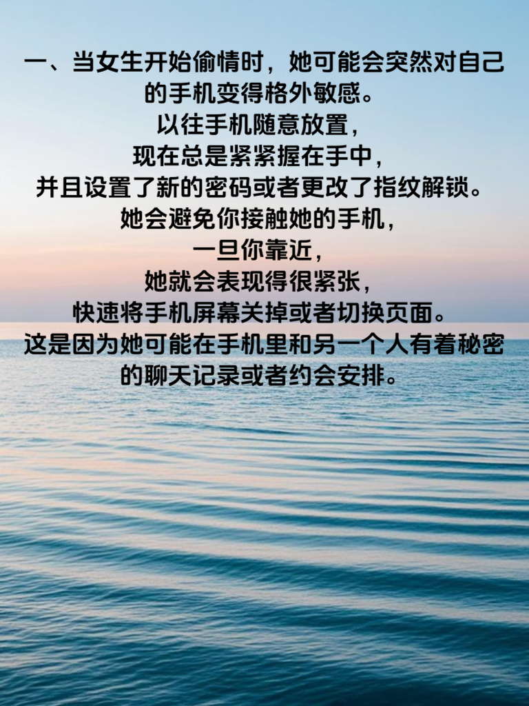 一、当女生开始偷情时,她可能会突然对自己的手机变得格外敏感。以往手机随意放置,现在总是紧紧握在手中,并且设置了新的密码或者更改了指纹解锁。她会避免你接触她的手机,一旦你靠近,她就会表现得很紧张,快速将手机屏幕关掉或者切换页面。这是因为她可能在手机里和另一个人有着秘密的聊天记录或者约会安排。 二、她的外出习惯也会有明显变化。以前可能比较宅,现在却常常找借口外出,而且对于外出的目的地和同行人员含糊其辞。她可能会说和朋友聚会,但却不愿意透露是哪些朋友,或者她会突然开始参加一些之前从未涉足的活动。比如她以前从不健身,现在却频繁去健身房,很有可能是在那里有了新的约会对象。 三、在对待你的态度上也会不同。她不再像以前那样依赖你、需要你,对你的关心也会减少。以前她会对你的喜怒哀乐很在意,现在却常常心不在焉。和你相处的时候,她的眼神会游离,不会像以前那样专注地看着你,因为她的心思可能已经放在了另一个人身上。男生们如果发现自己的女友有这些迹象,一定要冷静对待,好好沟通,找出问题的根源。