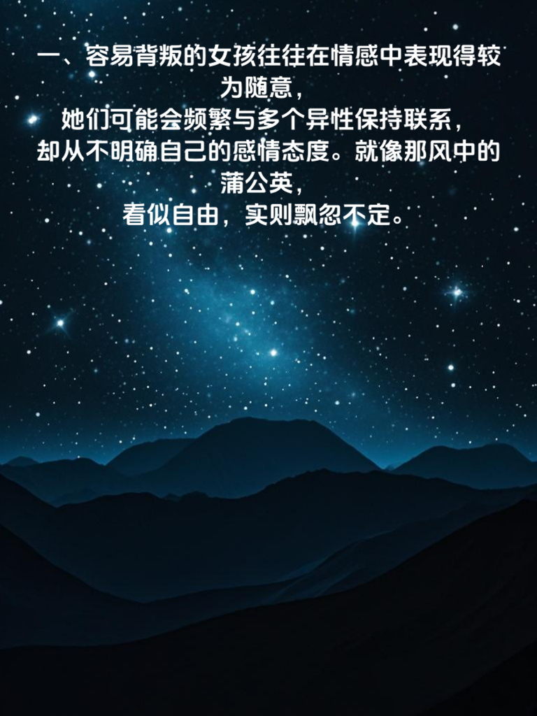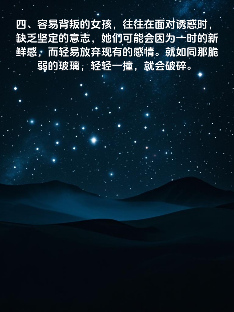 一、容易背叛的女孩往往在情感中表现得较为随意,她们可能会频繁与多个异性保持联系,却从不明确自己的感情态度。就像那风中的蒲公英,看似自由,实则飘忽不定。 二、当你发现她对过去的感情经历总是遮遮掩掩,不愿提及或刻意美化时,这可能是她背叛的一个信号。因为内心有愧,所以才不敢面对过去的错误。 三、在与她相处的过程中,如果她经常找各种借口推脱与你共度时光,而将更多的时间留给其他异性,那么她的心思很可能已经不在你身上了。 四、容易背叛的女孩往往在面对诱惑时缺乏坚定的意志,她们可能会因为一时的新鲜感而轻易放弃现有的感情。就如同那脆弱的玻璃,轻轻一撞就会破碎。