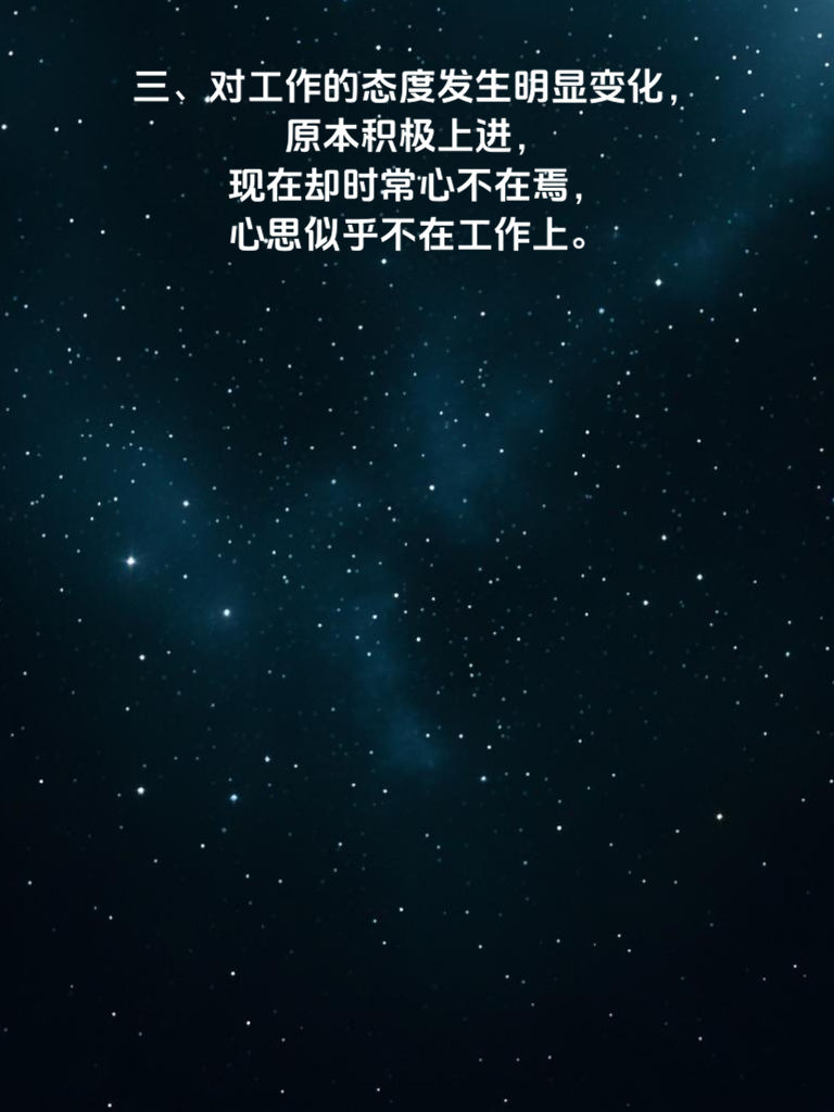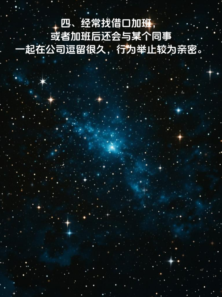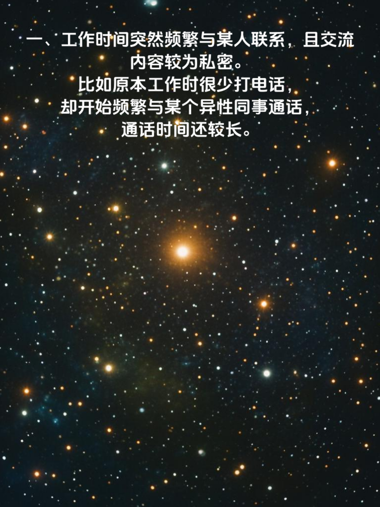 一、工作时间突然频繁与某人联系,且交流内容较为私密。比如原本工作时很少打电话,却开始频繁与某个异性同事通话,通话时间还较长。 二、开始注重自己的外在形象,比以往更在意穿着打扮。可能会突然购买一些平时不会穿的时尚服装,或者频繁去理发店做发型。 三、对工作的态度发生明显变化,原本积极上进,现在却时常心不在焉,心思似乎不在工作上。 四、经常找借口加班,或者加班后还会与某个同事一起在公司逗留很久,行为举止较为亲密。