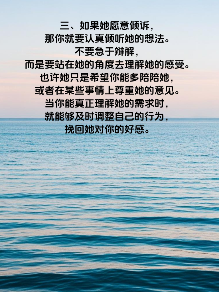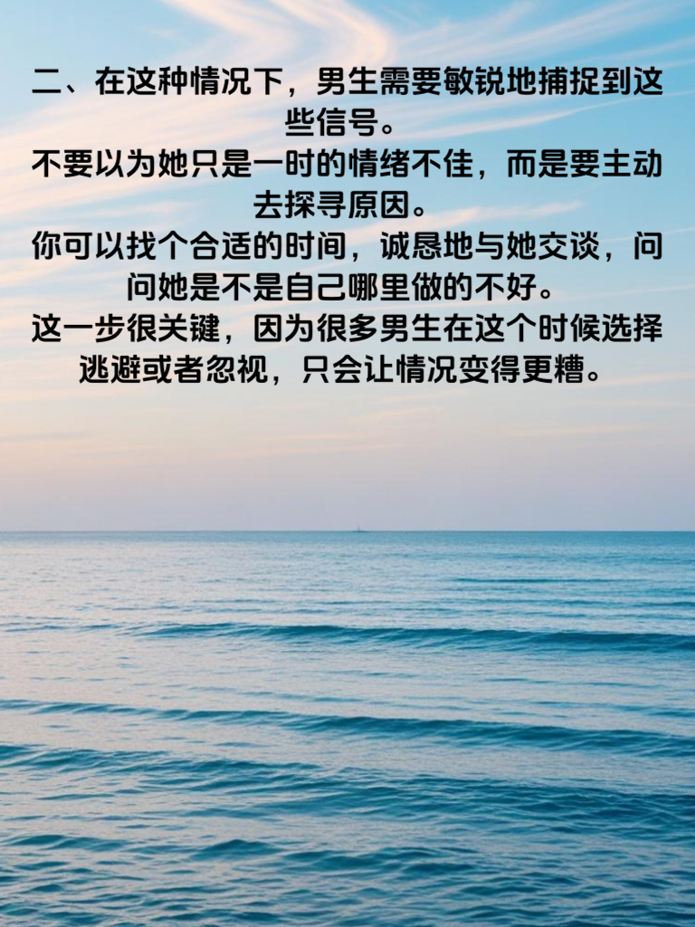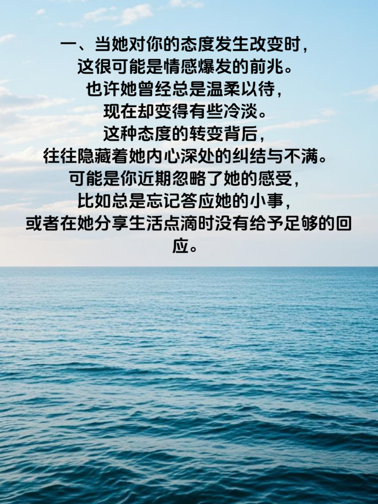 一、当她对你的态度发生改变时,这很可能是情感爆发的前兆。也许她曾经总是温柔以待,现在却变得有些冷淡。这种态度的转变背后,往往隐藏着她内心深处的纠结与不满。可能是你近期忽略了她的感受,比如总是忘记答应她的小事,或者在她分享生活点滴时没有给予足够的回应。 二、在这种情况下,男生需要敏锐地捕捉到这些信号。不要以为她只是一时的情绪不佳,而是要主动去探寻原因。你可以找个合适的时间,诚恳地与她交谈,问问她是不是自己哪里做的不好。这一步很关键,因为很多男生在这个时候选择逃避或者忽视,只会让情况变得更糟。 三、如果她愿意倾诉,那你就要认真倾听她的想法。不要急于辩解,而是要站在她的角度去理解她的感受。也许她只是希望你能多陪陪她,或者在某些事情上尊重她的意见。当你能真正理解她的需求时,就能够及时调整自己的行为,挽回她对你的好感。