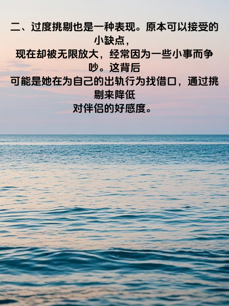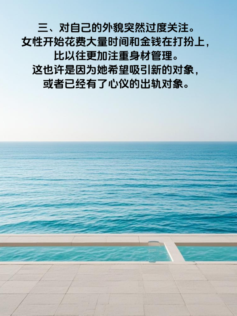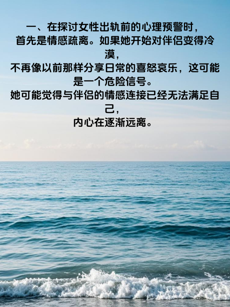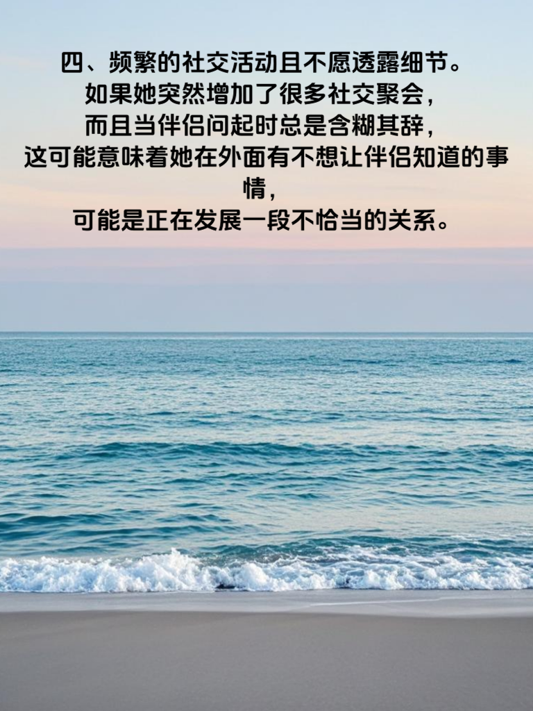 一、在探讨女性出轨前的心理预警时,首先是情感疏离。如果她开始对伴侣变得冷漠,不再像以前那样分享日常的喜怒哀乐,这可能是一个危险信号。她可能觉得与伴侣的情感连接已经无法满足自己,内心在逐渐远离。 二、过度挑剔也是一种表现。原本可以接受的小缺点,现在却被无限放大,经常因为一些小事而争吵。这背后可能是她在为自己的出轨行为找借口,通过挑剔来降低对伴侣的好感度。 三、对自己的外貌突然过度关注。女性开始花费大量时间和金钱在打扮上,比以往更加注重身材管理。这也许是因为她希望吸引新的对象,或者已经有了心仪的出轨对象。 四、频繁的社交活动且不愿透露细节。如果她突然增加了很多社交聚会,而且当伴侣问起时总是含糊其辞,这可能意味着她在外面有不想让伴侣知道的事情,可能是正在发展一段不恰当的关系。