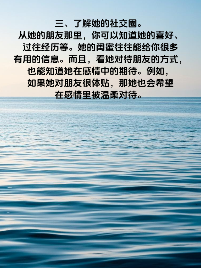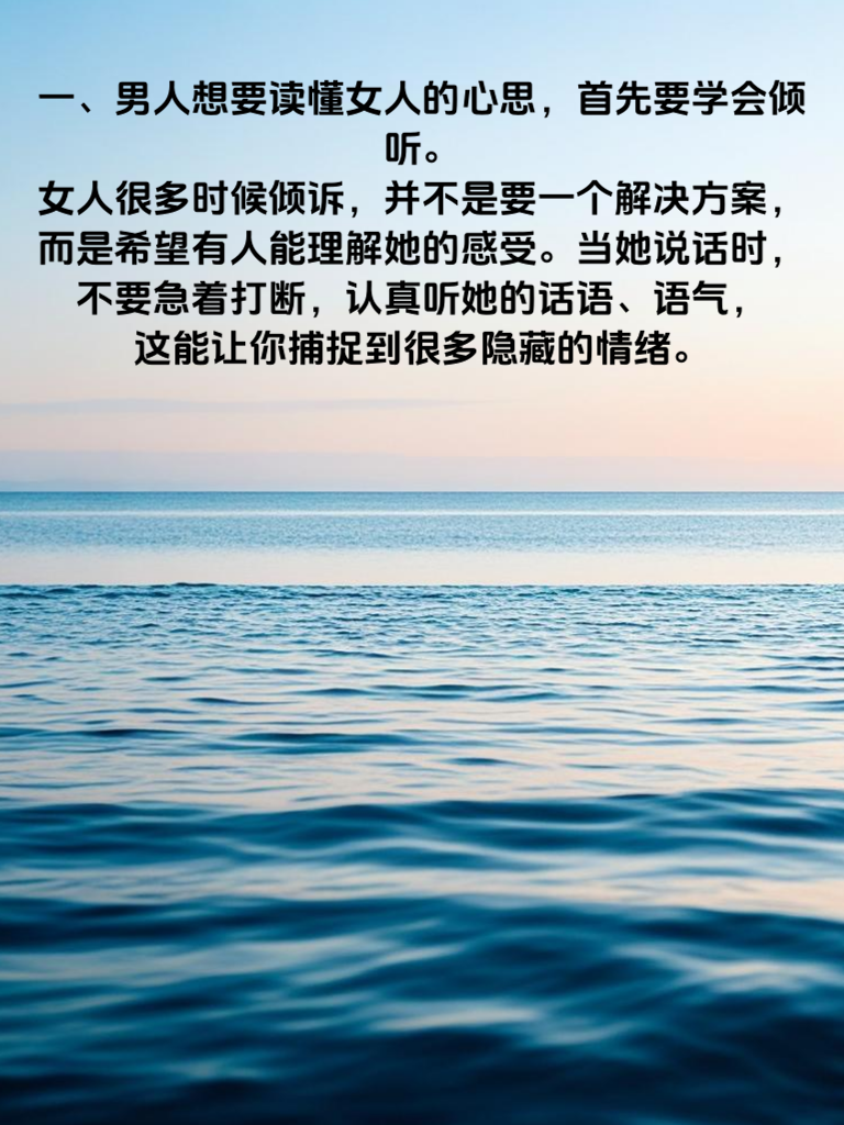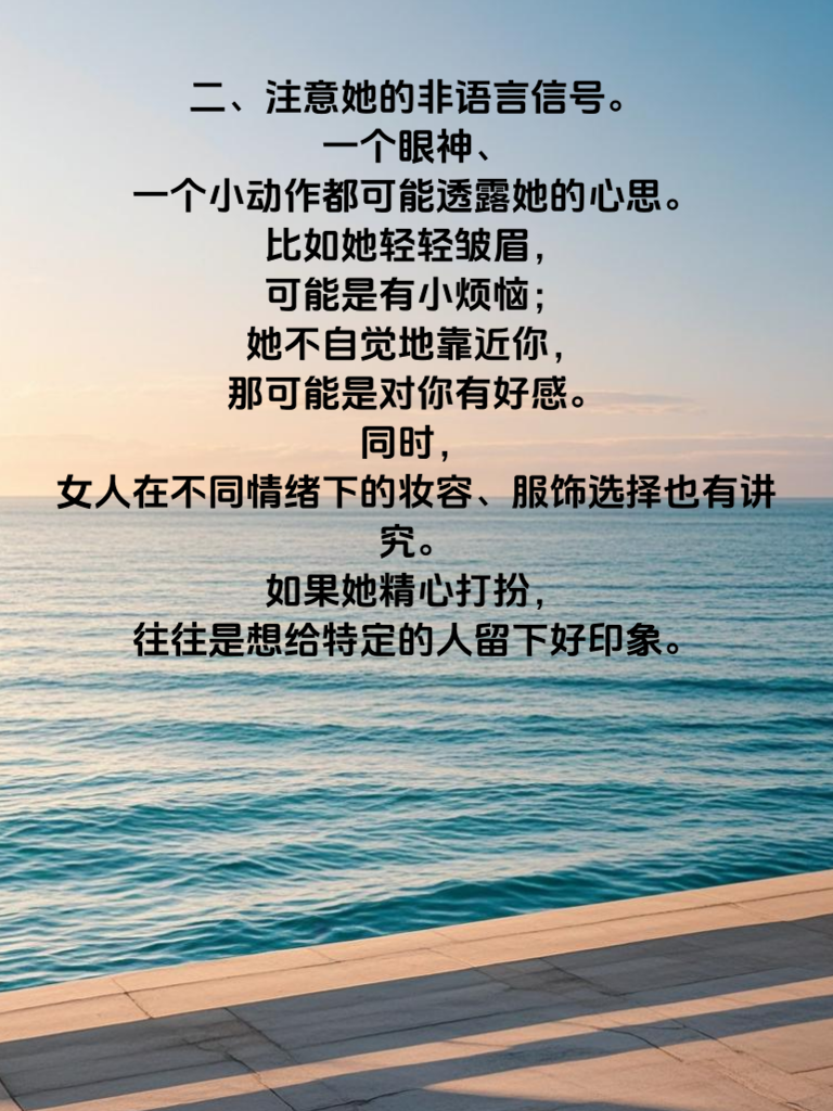 一、男人想要读懂女人的心思,首先要学会倾听。女人很多时候倾诉并不是要一个解决方案,而是希望有人能理解她的感受。当她说话时,不要急着打断,认真听她的话语、语气,这能让你捕捉到很多隐藏的情绪。 二、注意她的非语言信号。一个眼神、一个小动作都可能透露她的心思。比如她轻轻皱眉,可能是有小烦恼;她不自觉地靠近你,那可能是对你有好感。同时,女人在不同情绪下的妆容、服饰选择也有讲究。如果她精心打扮,往往是想给特定的人留下好印象。 三、了解她的社交圈。从她的朋友那里,你可以知道她的喜好、过往经历等。她的闺蜜往往能给你很多有用的信息。而且,看她对待朋友的方式,也能知道她在感情中的期待。例如,如果她对朋友很体贴,那她也会希望在感情里被温柔对待。