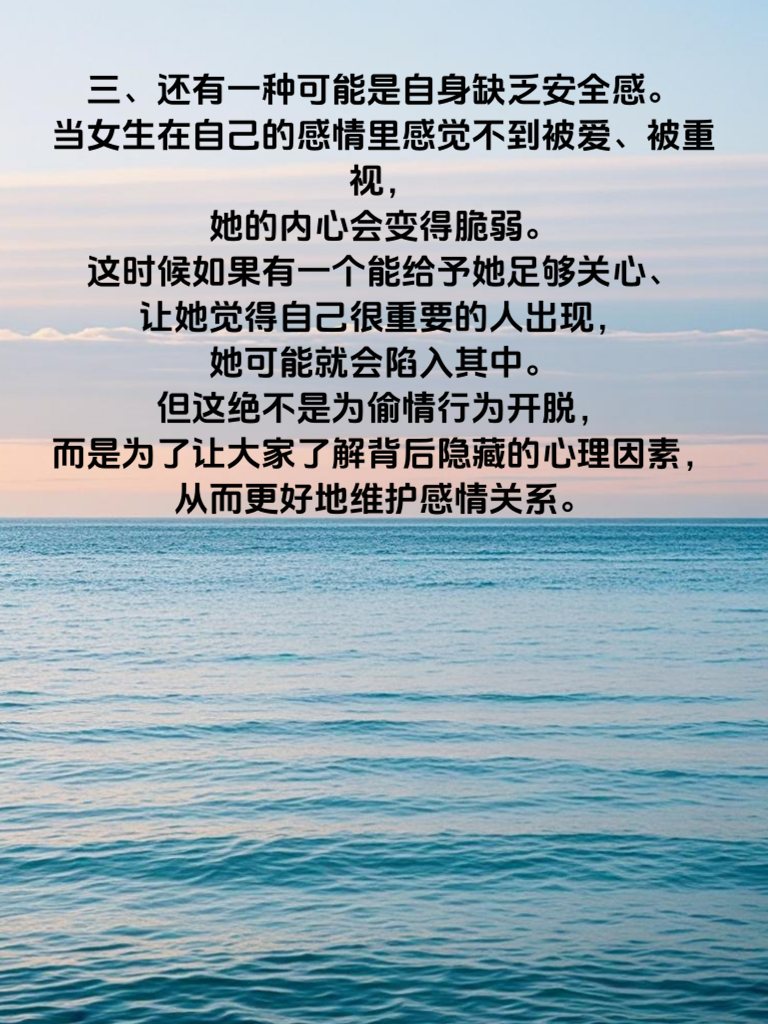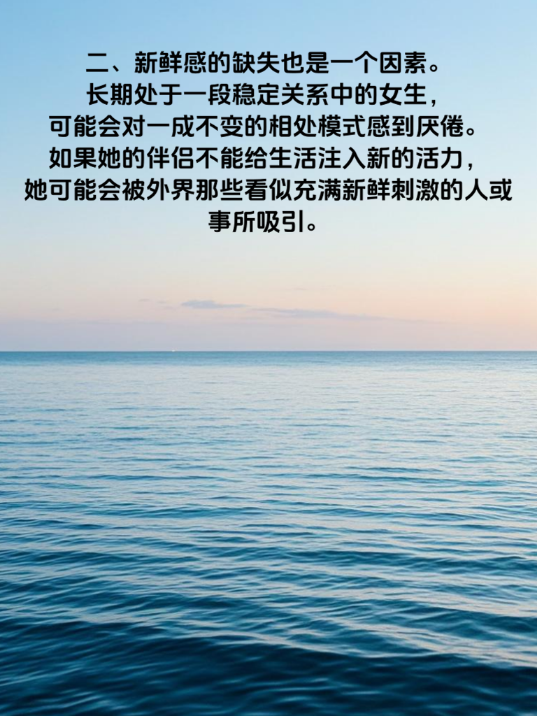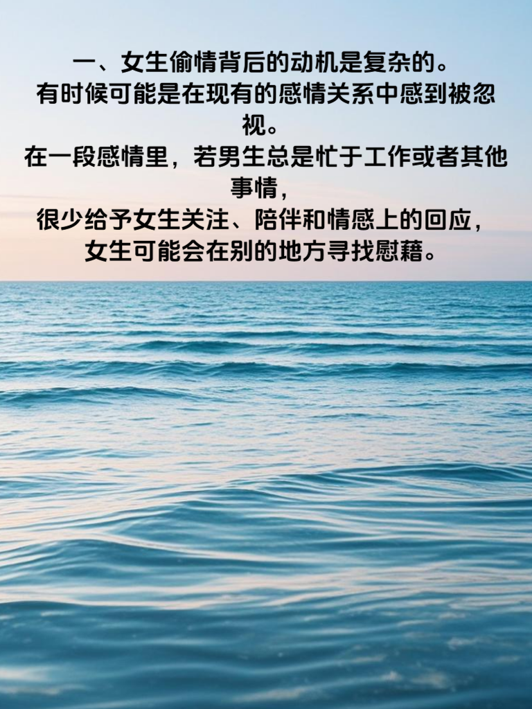 一、女生偷情背后的动机是复杂的。有时候可能是在现有的感情关系中感到被忽视。在一段感情里,若男生总是忙于工作或者其他事情,很少给予女生关注、陪伴和情感上的回应,女生可能会在别的地方寻找慰藉。 二、新鲜感的缺失也是一个因素。长期处于一段稳定关系中的女生,可能会对一成不变的相处模式感到厌倦。如果她的伴侣不能给生活注入新的活力,她可能会被外界那些看似充满新鲜刺激的人或事所吸引。 三、还有一种可能是自身缺乏安全感。当女生在自己的感情里感觉不到被爱、被重视,她的内心会变得脆弱。这时候如果有一个能给予她足够关心、让她觉得自己很重要的人出现,她可能就会陷入其中。但这绝不是为偷情行为开脱,而是为了让大家了解背后隐藏的心理因素,从而更好地维护感情关系。