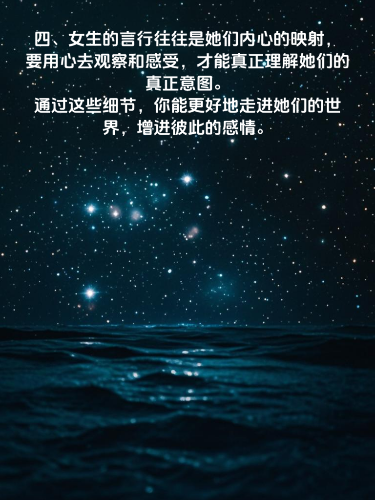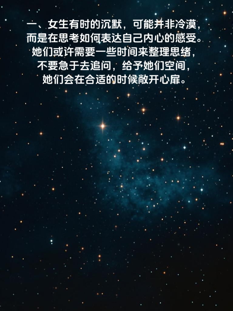 一、女生有时的沉默,可能并非冷漠,而是在思考如何表达自己内心的感受。她们或许需要一些时间来整理思绪,不要急于去追问,给予她们空间,她们会在合适的时候敞开心扉。 二、女生的撒娇,其实是一种寻求关注和安慰的方式。不要觉得她无理取闹,用温柔的拥抱和耐心的倾听,让她感受到你的在乎。 三、当女生突然变得很安静或者情绪低落时,不要忽视她。试着去了解她的内心世界,陪伴她度过难关,这会让她对你更加依赖。 四、女生的言行往往是她们内心的映射,要用心去观察和感受,才能真正理解她们的真正意图。通过这些细节,你能更好地走进她们的世界,增进彼此的感情。