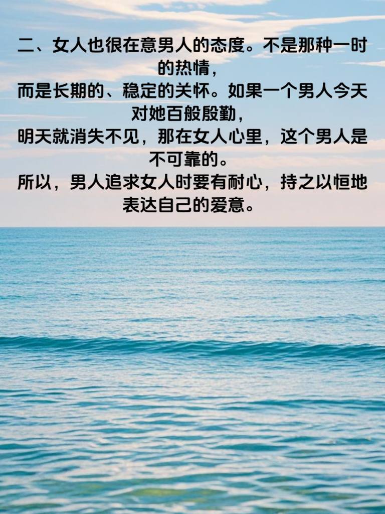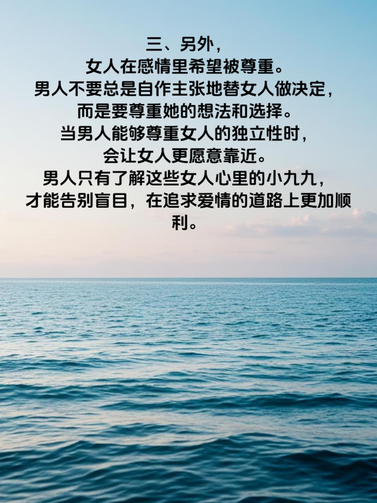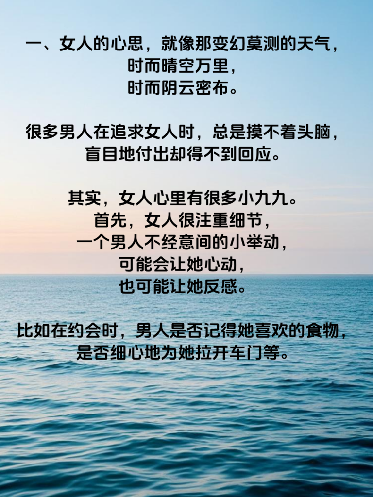 一、女人的心思,就像那变幻莫测的天气,时而晴空万里,时而阴云密布。很多男人在追求女人时,总是摸不着头脑,盲目地付出却得不到回应。其实,女人心里有很多小九九。首先,女人很注重细节,一个男人不经意间的小举动,可能会让她心动,也可能让她反感。比如在约会时,男人是否记得她喜欢的食物,是否细心地为她拉开车门等。 二、女人也很在意男人的态度。不是那种一时的热情,而是长期的、稳定的关怀。如果一个男人今天对她百般殷勤,明天就消失不见,那在女人心里,这个男人是不可靠的。所以,男人追求女人时要有耐心,持之以恒地表达自己的爱意。 三、另外,女人在感情里希望被尊重。男人不要总是自作主张地替女人做决定,而是要尊重她的想法和选择。当男人能够尊重女人的独立性时,会让女人更愿意靠近。男人只有了解这些女人心里的小九九,才能告别盲目,在追求爱情的道路上更加顺利。