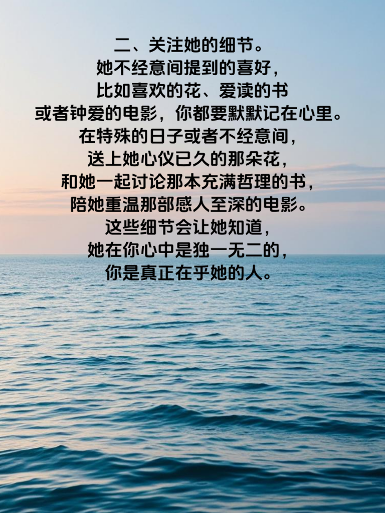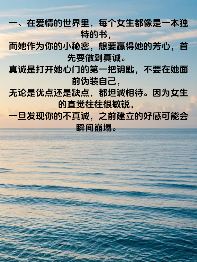 一、在爱情的世界里,每个女生都像是一本独特的书,而她作为你的小秘密,想要赢得她的芳心,首先要做到真诚。真诚是打开她心门的第一把钥匙,不要在她面前伪装自己,无论是优点还是缺点,都坦诚相待。因为女生的直觉往往很敏锐,一旦发现你的不真诚,之前建立的好感可能会瞬间崩塌。 二、关注她的细节。她不经意间提到的喜好,比如喜欢的花、爱读的书或者钟爱的电影,你都要默默记在心里。在特殊的日子或者不经意间送上她心仪已久的那朵花,和她一起讨论那本充满哲理的书,陪她重温那部感人至深的电影。这些细节会让她知道,她在你心中是独一无二的,你是真正在乎她的人。 三、给予她足够的安全感。在感情里,女生大多是缺乏安全感的。你要让她知道,你的心里只有她。和其他异性保持适当的距离,及时回复她的消息,不要让她在等待中产生猜疑。当她感受到满满的安全感时,她的心就会慢慢向你靠近,你离赢得她的芳心也就不远了。
