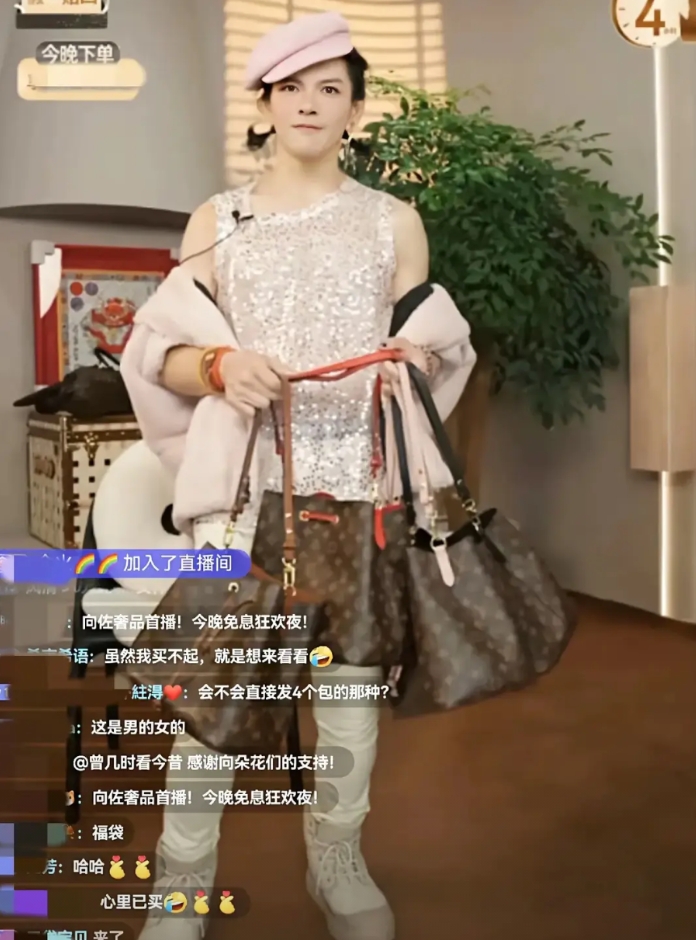 直播间穿女装带货,还扎两个小揪揪,扮相粉嫩妖娆。
