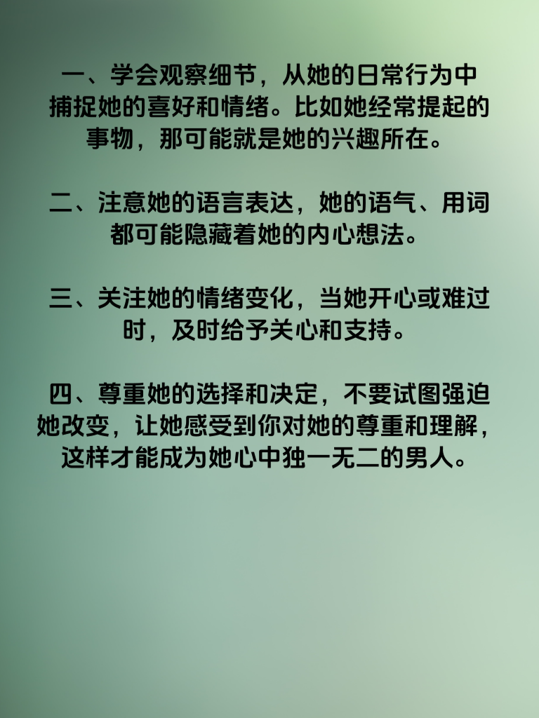 一、学会观察细节,从她的日常行为中捕捉她的喜好和情绪。比如她经常提起的事物,那可能就是她的兴趣所在。二、注意她的语言表达,她的语气、用词都可能隐藏着她的内心想法。三、关注她的情绪变化,当她开心或难过时,及时给予关心和支持。四、尊重她的选择和决定,不要试图强迫她改变,让她感受到你对她的尊重和理解,这样才能成为她心中独一无二的男人。