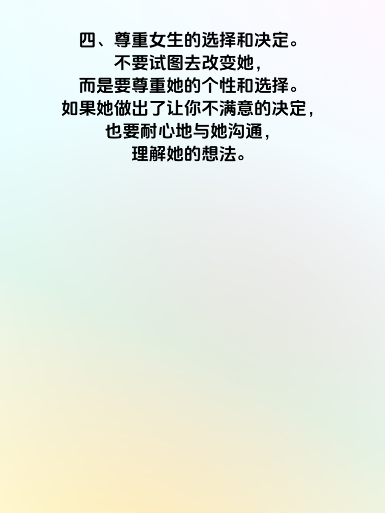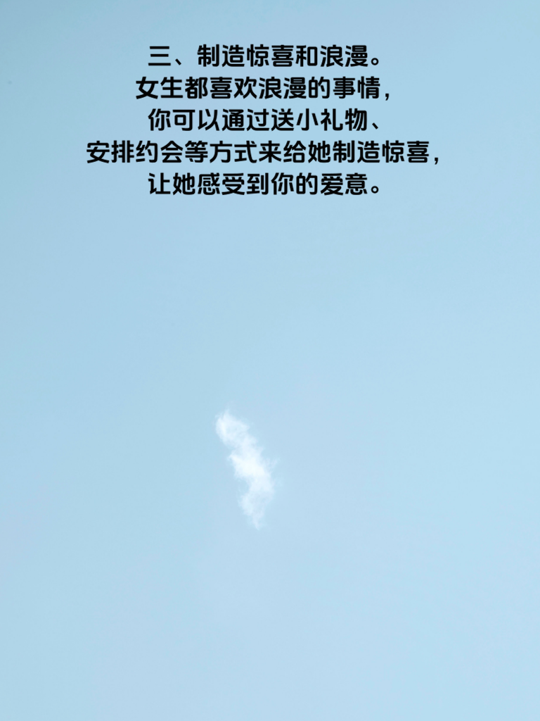 一、学会倾听女生的心声,这是打开她内心世界的钥匙。不要总是急于表达自己的观点,而是要用心去感受她的喜怒哀乐,让她感受到你对她的关注和尊重。 二、保持自信但不张扬。自信的男生会让女生觉得有安全感,而过度张扬则会让女生感到反感。展现出自己的优点和魅力,但不要过于自负。 三、制造惊喜和浪漫。女生都喜欢浪漫的事情,你可以通过送小礼物、安排约会等方式来给她制造惊喜,让她感受到你的爱意。 四、尊重女生的选择和决定。不要试图去改变她,而是要尊重她的个性和选择。如果她做出了让你不满意的决定,也要耐心地与她沟通,理解她的想法