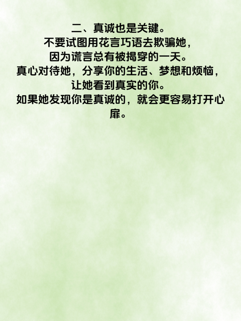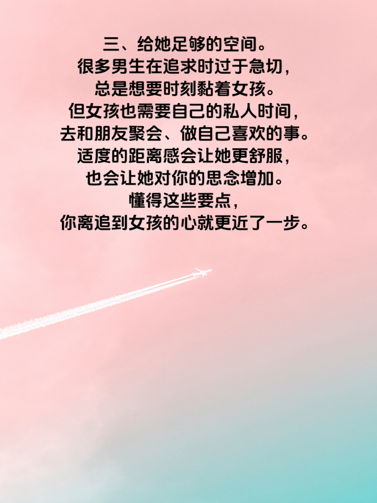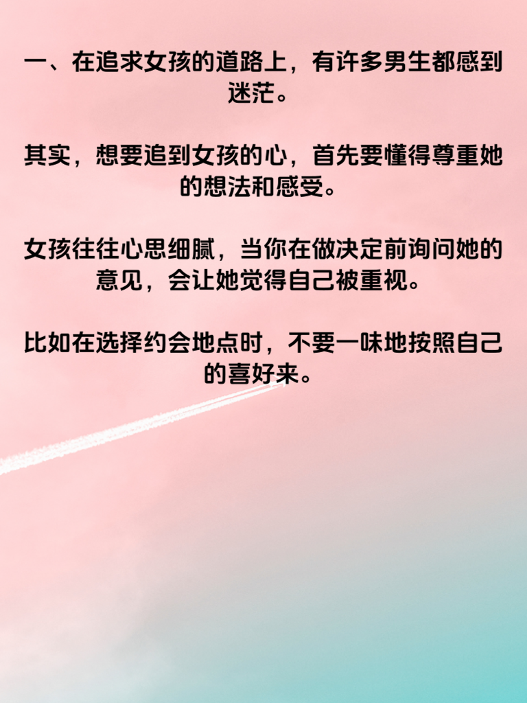 一、在追求女孩的道路上,有许多男生都感到迷茫。其实,想要追到女孩的心,首先要懂得尊重她的想法和感受。女孩往往心思细腻,当你在做决定前询问她的意见,会让她觉得自己被重视。比如在选择约会地点时,不要一味地按照自己的喜好来。 二、真诚也是关键。不要试图用花言巧语去欺骗她,因为谎言总有被揭穿的一天。真心对待她,分享你的生活、梦想和烦恼,让她看到真实的你。如果她发现你是真诚的,就会更容易打开心扉。 三、给她足够的空间。很多男生在追求时过于急切,总是想要时刻黏着女孩。但女孩也需要自己的私人时间去和朋友聚会、做自己喜欢的事。适度的距离感会让她更舒服,也会让她对你的思念增加。懂得这些要点,你离追到女孩的心就更近了一步。