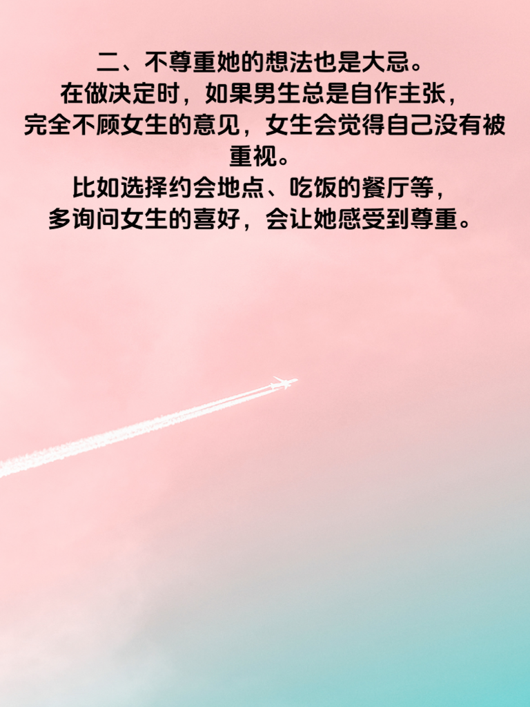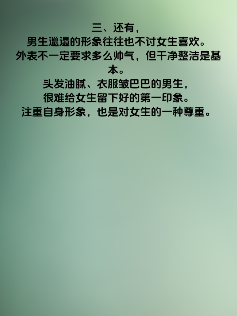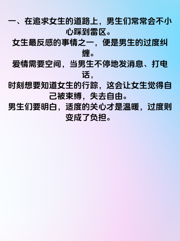 一、在追求女生的道路上,男生们常常会不小心踩到雷区。女生最反感的事情之一,便是男生的过度纠缠。爱情需要空间,当男生不停地发消息、打电话,时刻想要知道女生的行踪,这会让女生觉得自己被束缚,失去自由。男生们要明白,适度的关心才是温暖,过度则变成了负担。 二、不尊重她的想法也是大忌。在做决定时,如果男生总是自作主张,完全不顾女生的意见,女生会觉得自己没有被重视。比如选择约会地点、吃饭的餐厅等,多询问女生的喜好,会让她感受到尊重。 三、还有,男生邋遢的形象往往也不讨女生喜欢。外表不一定要求多么帅气,但干净整洁是基本。头发油腻、衣服皱巴巴的男生,很难给女生留下好的第一印象。注重自身形象,也是对女生的一种尊重。