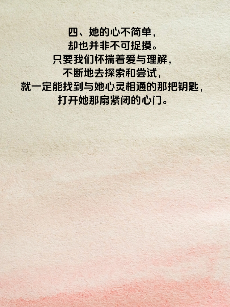 四、她的心不简单,却也并非不可捉摸。只要我们怀揣着爱与理解,不断地去探索和尝试,就一定能找到与她心灵相通的那把钥匙,打开她那扇紧闭的心门。