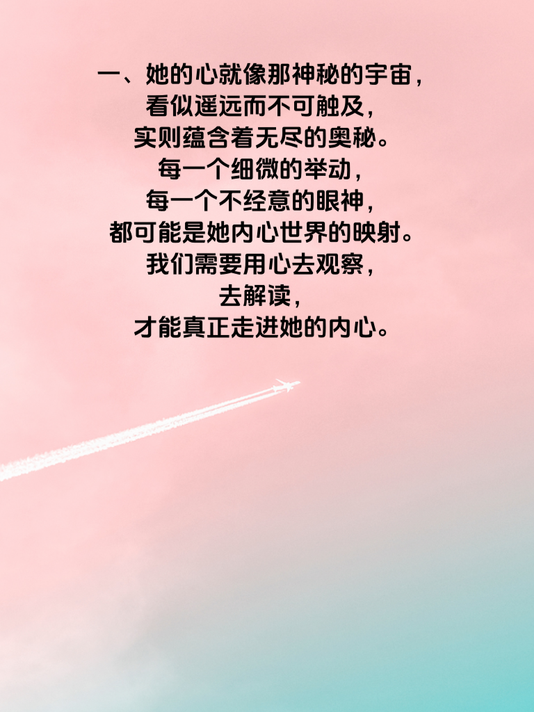 一、她的心就像那神秘的宇宙,看似遥远而不可触及,实则蕴含着无尽的奥秘。每一个细微的举动,每一个不经意的眼神,都可能是她内心世界的映射。我们需要用心去观察,去解读,才能真正走进她的内心。