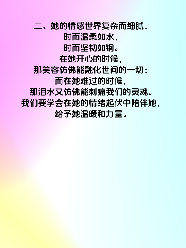 二、她的情感世界复杂而细腻,时而温柔如水,时而坚韧如钢。在她开心的时候,那笑容仿佛能融化世间的一切;而在她难过的时候,那泪水又仿佛能刺痛我们的灵魂。我们要学会在她的情绪起伏中陪伴她,给予她温暖和力量。