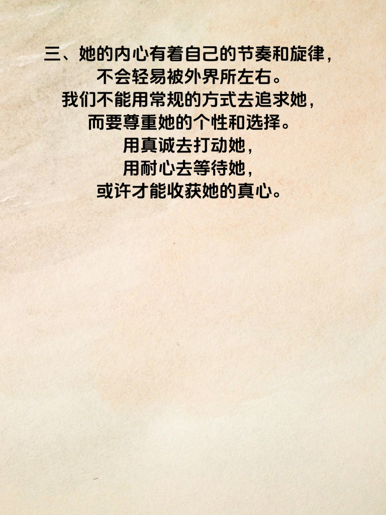 三、她的内心有着自己的节奏和旋律,不会轻易被外界所左右。我们不能用常规的方式去追求她,而要尊重她的个性和选择。用真诚去打动她,用耐心去等待她,或许才能收获她的真心。