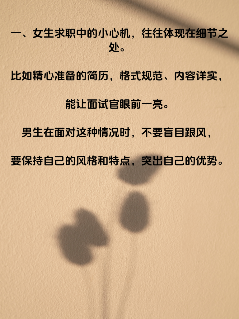 一、女生求职中的小心机,往往体现在细节之处。比如精心准备的简历,格式规范、内容详实,能让面试官眼前一亮。男生在面对这种情况时,不要盲目跟风,要保持自己的风格和特点,突出自己的优势。