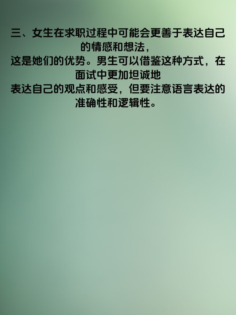 三、女生在求职过程中可能会更善于表达自己的情感和想法,这是她们的优势。男生可以借鉴这种方式,在面试中更加坦诚地表达自己的观点和感受,但要注意语言表达的准确性和逻辑性。