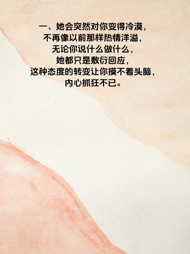一、她会突然对你变得冷漠,不再像以前那样热情洋溢,无论你说什么做什么,她都只是敷衍回应,这种态度的转变让你摸不着头脑,内心抓狂不已。