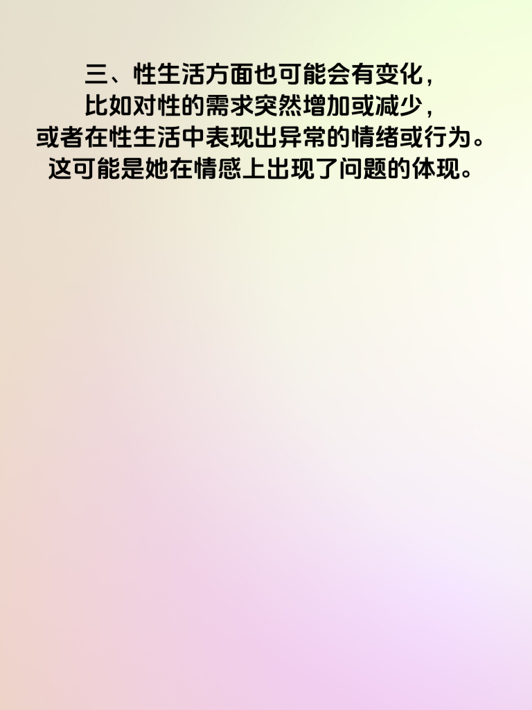 三、性生活方面也可能会有变化,比如对性的需求突然增加或减少,或者在性生活中表现出异常的情绪或行为。这可能是她在情感上出现了问题的体现。
