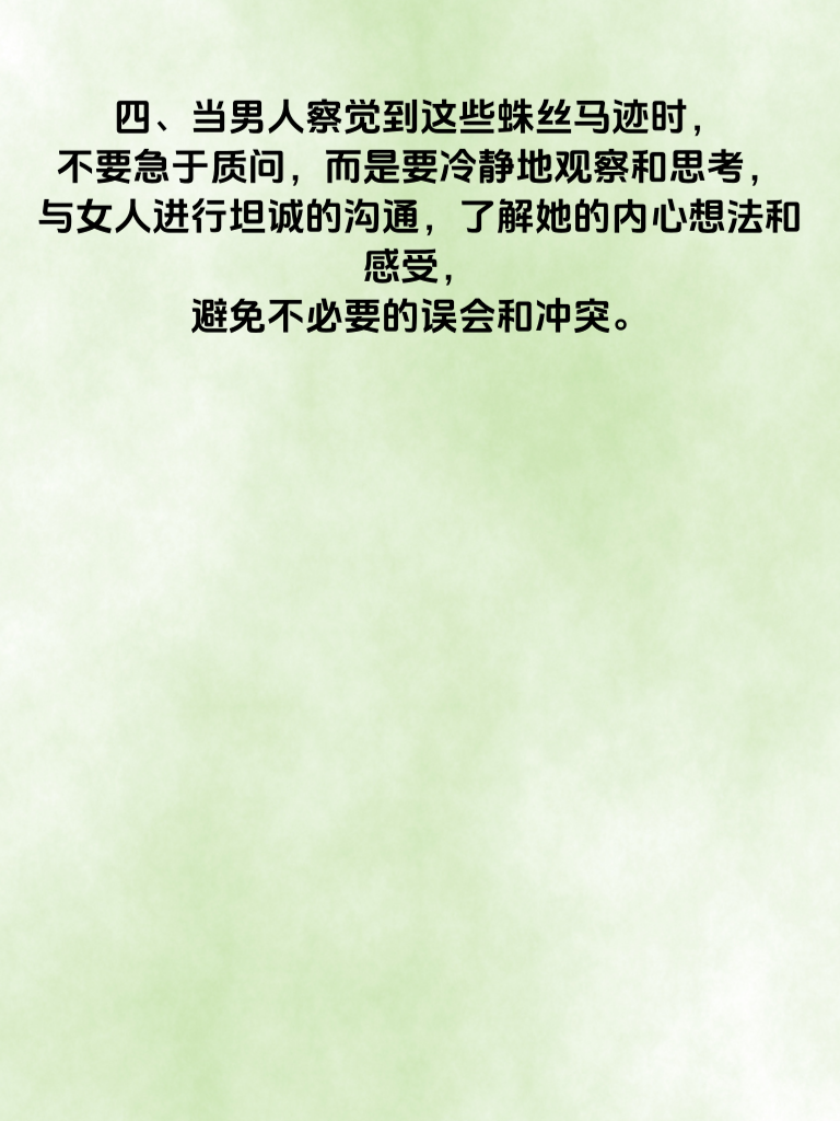 四、当男人察觉到这些蛛丝马迹时,不要急于质问,而是要冷静地观察和思考,与女人进行坦诚的沟通,了解她的内心想法和感受,避免不必要的误会和冲突。
