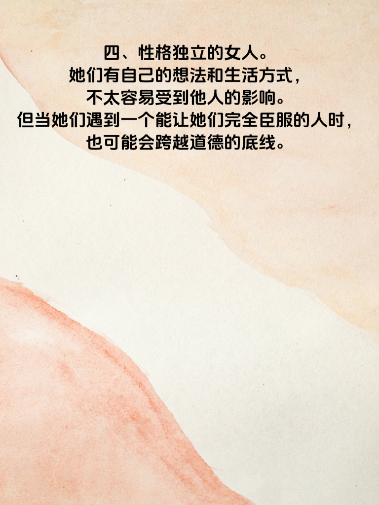 四、性格独立的女人。她们有自己的想法和生活方式,不太容易受到他人的影响。但当她们遇到一个能让她们完全臣服的人时,也可能会跨越道德的底线。