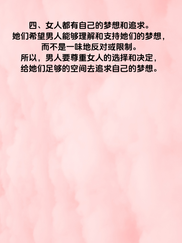 四、女人都有自己的梦想和追求。她们希望男人能够理解和支持她们的梦想,而不是一味地反对或限制。所以,男人要尊重女人的选择和决定,给她们足够的空间去追求自己的梦想。