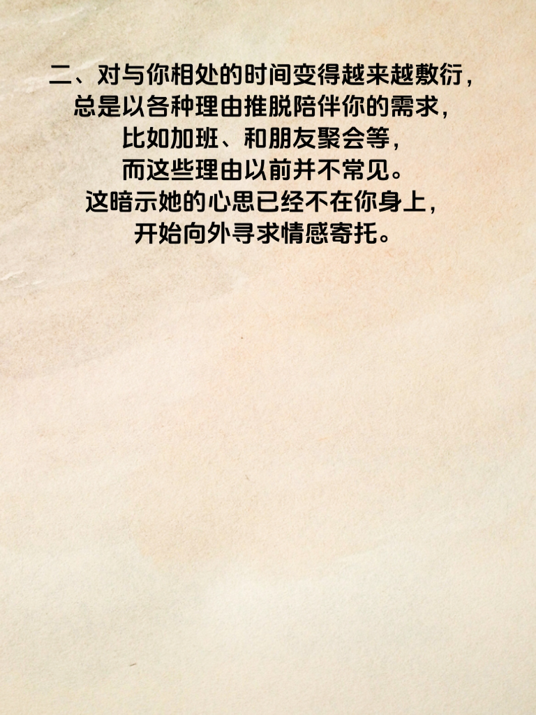 二、对与你相处的时间变得越来越敷衍,总是以各种理由推脱陪伴你的需求,比如加班、和朋友聚会等,而这些理由以前并不常见。这暗示她的心思已经不在你身上,开始向外寻求情感寄托。