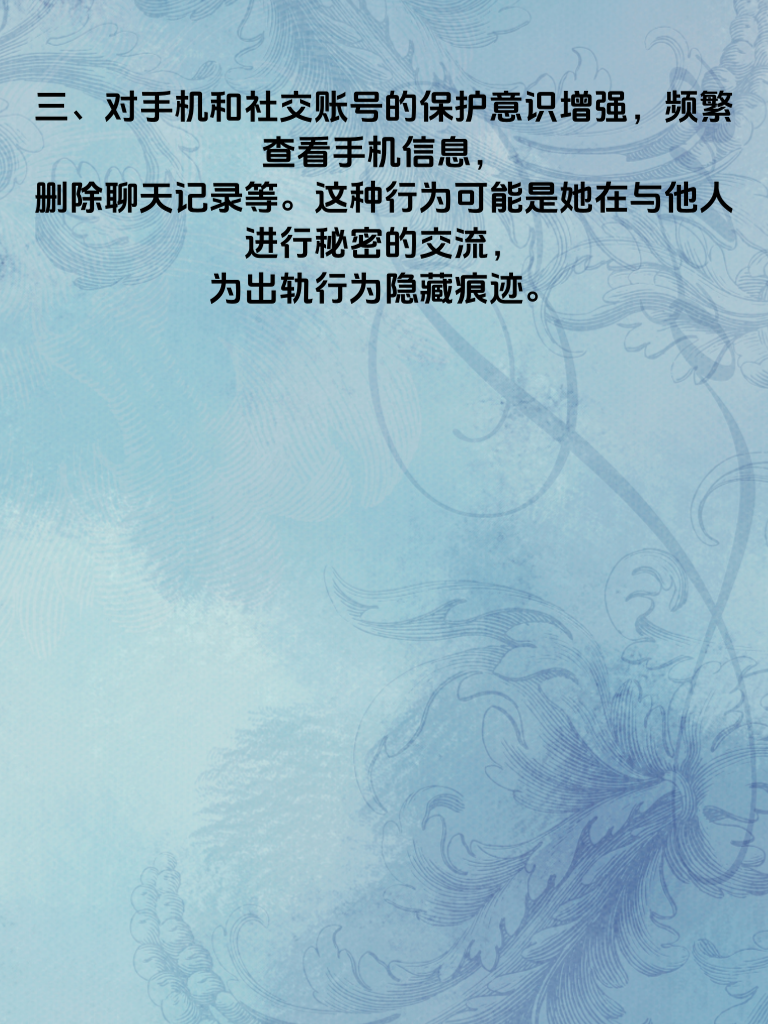 三、对手机和社交账号的保护意识增强,频繁查看手机信息,删除聊天记录等。这种行为可能是她在与他人进行秘密的交流,为出轨行为隐藏痕迹。