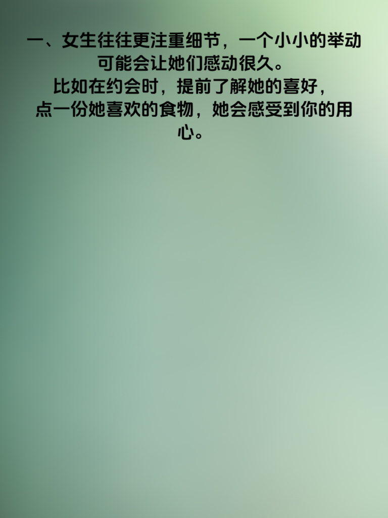 一、女生往往更注重细节,一个小小的举动可能会让她们感动很久。比如在约会时,提前了解她的喜好,点一份她喜欢的食物,她会感受到你的用心。 二、女生在面对感情时,可能会比较敏感,需要男生更多的关心和呵护。一句温暖的问候,一个拥抱,都能让她们的心情变得愉悦。 三、女生喜欢被赞美,不要吝啬你的赞美之词,真诚地夸赞她的优点,会让她更加自信和开心。 四、女生有时候需要男生的引导和支持,在她遇到困难时,给予她鼓励和帮助,让她知道你会一直在她身边。