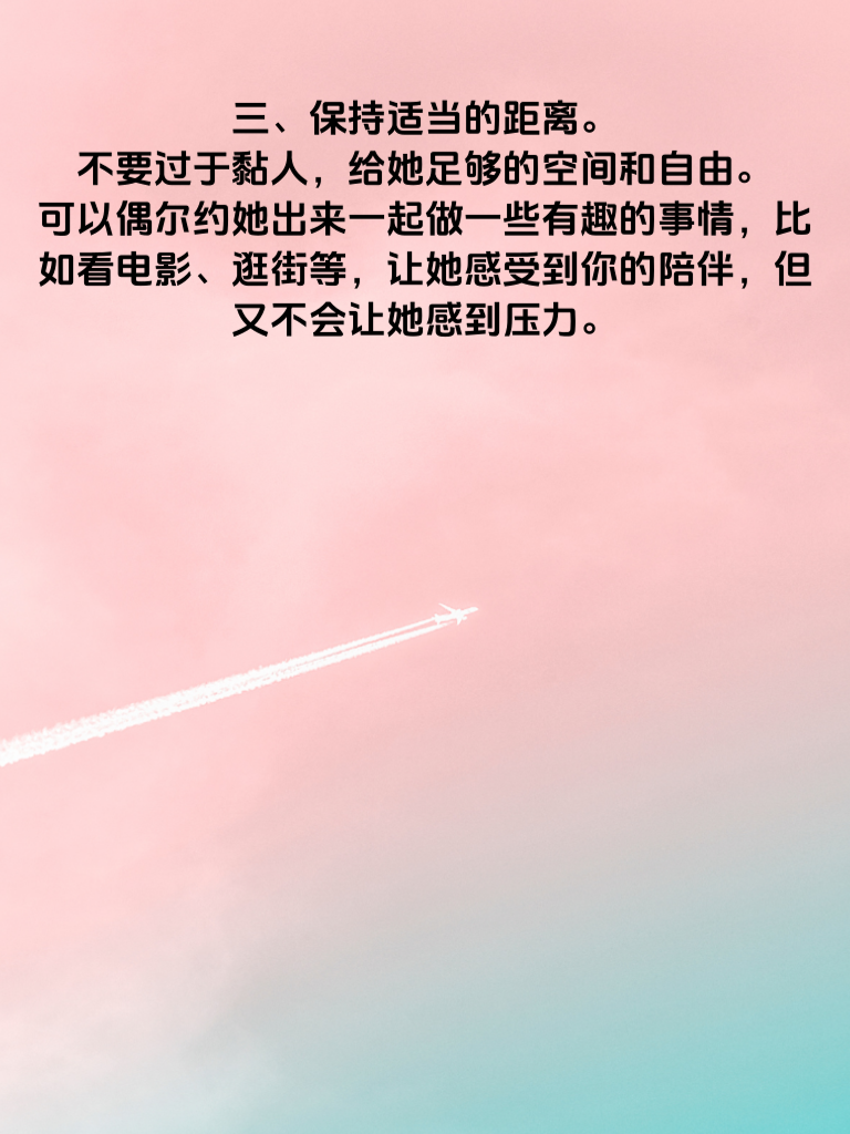 一、细节之处见真心。在追求女生时,不要只注重表面的浪漫,细节往往更能打动她的心。比如记住她的喜好,送她一份她一直想要的小礼物;或者在她忙碌时,默默地为她准备一杯咖啡,这些小小的举动会让她感受到你的关心。 二、展现自己的优点。但不要过于张扬,要自然地展示出你的才华和魅力。可以和她分享你擅长的事情,比如你会弹吉他,就给她弹一首她喜欢的曲子;或者你很会做饭,就邀请她一起品尝你的手艺。 三、保持适当的距离。不要过于黏人,给她足够的空间和自由。可以偶尔约她出来一起做一些有趣的事情,比如看电影、逛街等,让她感受到你的陪伴,但又不会让她感到压力。 四、学会倾听。在和她相处的过程中,要认真倾听她的想法和感受,不要打断她。让她感受到你对她的尊重和理解,这样她才会更愿意和你交流。
