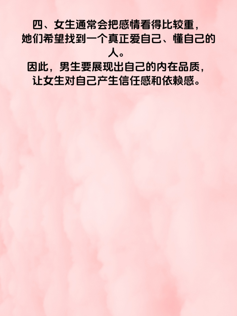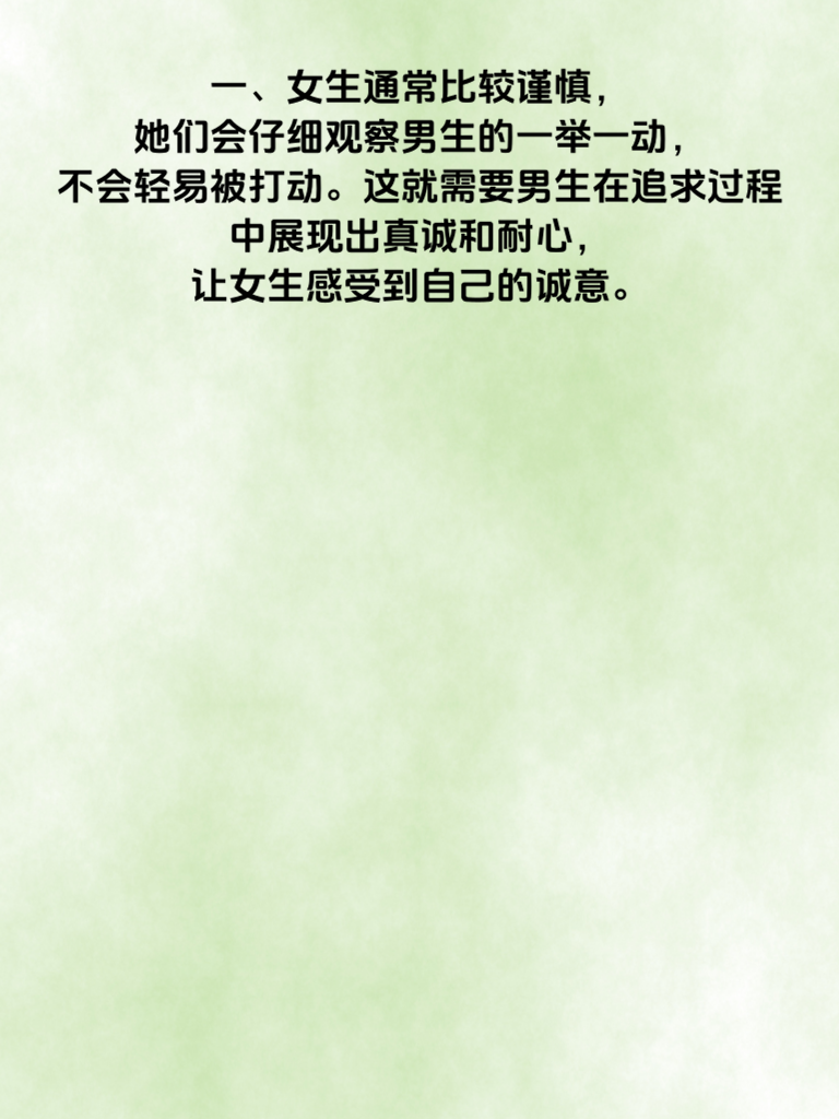 一、女生通常比较谨慎,她们会仔细观察男生的一举一动,不会轻易被打动。这就需要男生在追求过程中展现出真诚和耐心,让女生感受到自己的诚意。 二、女生往往更注重细节,一个小小的举动或者一句话都可能影响她们对男生的看法。所以男生要在细节上下功夫,比如记住女生的喜好、生日等。 三、女生的内心比较敏感,她们很容易受到伤害。男生在追求过程中要注意自己的言行举止,不要给女生带来不必要的压力或者伤害。 四、女生通常会把感情看得比较重,她们希望找到一个真正爱自己、懂自己的人。因此,男生要展现出自己的内在品质,让女生对自己产生信任感和依赖感。