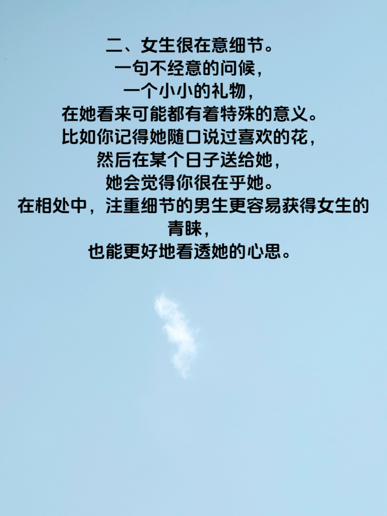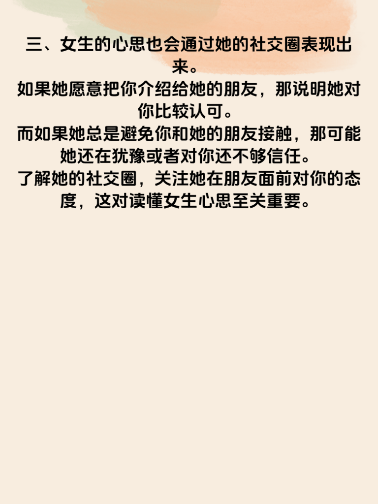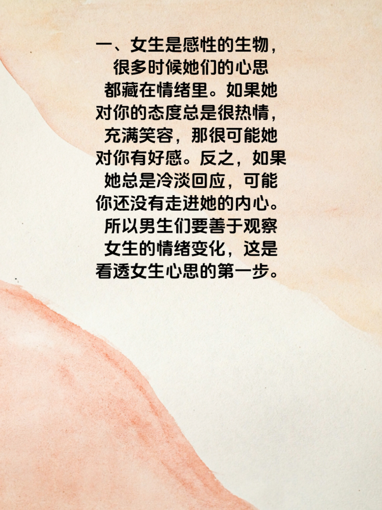 一、女生是感性的生物,很多时候她们的心思都藏在情绪里。如果她对你的态度总是很热情,充满笑容,那很可能她对你有好感。反之,如果她总是冷淡回应,可能你还没有走进她的内心。所以男生们要善于观察女生的情绪变化,这是看透女生心思的第一步。 二、女生很在意细节。一句不经意的问候,一个小小的礼物,在她看来可能都有着特殊的意义。比如你记得她随口说过喜欢的花,然后在某个日子送给她,她会觉得你很在乎她。在相处中,注重细节的男生更容易获得女生的青睐,也能更好地看透她的心思。 三、女生的心思也会通过她的社交圈表现出来。如果她愿意把你介绍给她的朋友,那说明她对你比较认可。而如果她总是避免你和她的朋友接触,那可能她还在犹豫或者对你还不够信任。了解她的社交圈,关注她在朋友面前对你的态度,这对读懂女生心思至关重要。