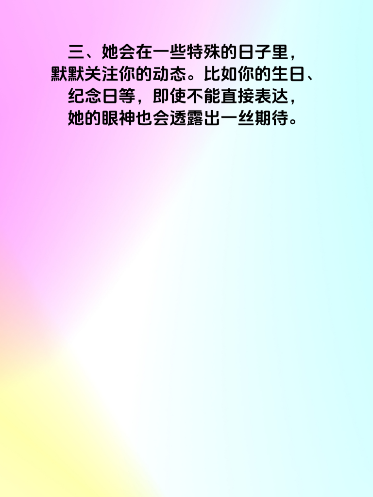 一、她会时不时地打听你的近况,看似不经意,实则内心在意。比如在共同好友面前,会巧妙地询问你的生活点滴,这表明她对你的关注度从未降低。 二、她会保留与你有关的物品,或许是一件小饰品,或许是一张合影。这些物品就像她心中的纽带,时刻提醒着她曾经的感情。 三、她会在一些特殊的日子里,默默关注你的动态。比如你的生日、纪念日等,即使不能直接表达,她的眼神也会透露出一丝期待。 四、当你们偶然相遇时,她的眼神会不自觉地停留片刻,脸上的表情也会有细微的变化,这都暗示着她对你依然有着特殊的情感。