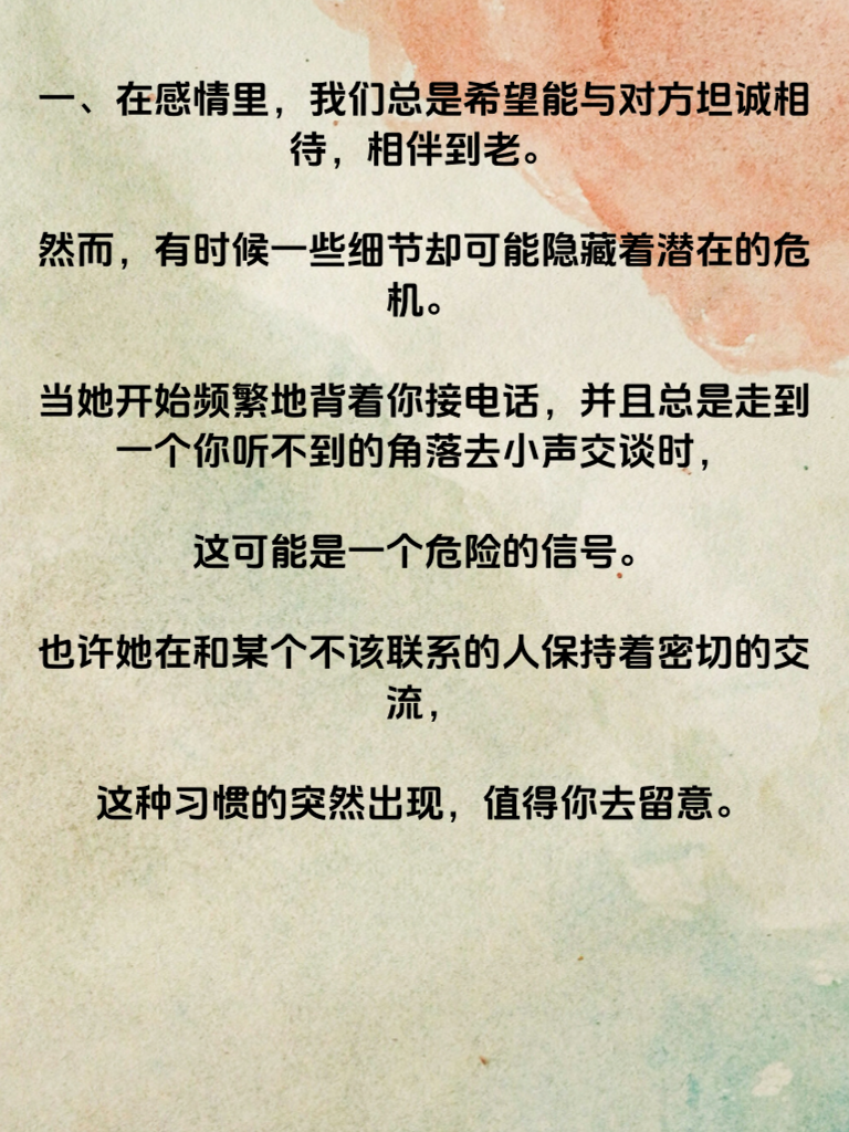 一、在感情里,我们总是希望能与对方坦诚相待,相伴到老。然而,有时候一些细节却可能隐藏着潜在的危机。当她开始频繁地背着你接电话,并且总是走到一个你听不到的角落去小声交谈时,这可能是一个危险的信号。也许她在和某个不该联系的人保持着密切的交流,这种习惯的突然出现,值得你去留意。 二、如果她突然变得很注重自己的外表,这本身并没有错,但若是过度,比如每天都精心打扮却不是为了和你约会,那可能就有问题了。她可能在试图吸引其他人的目光,有可能是在为一段新的感情关系做铺垫。 三、她开始频繁地参加一些没有你的聚会,而且对聚会的具体情况含糊其辞,不愿意详细说明。这时候,她很可能在聚会上结识了新的异性,并且不想让你知道她和这些人的交往情况。当然,这并不意味着她一定出轨了,但这些习惯的改变确实透露出了潜在的风险,需要你去谨慎对待。